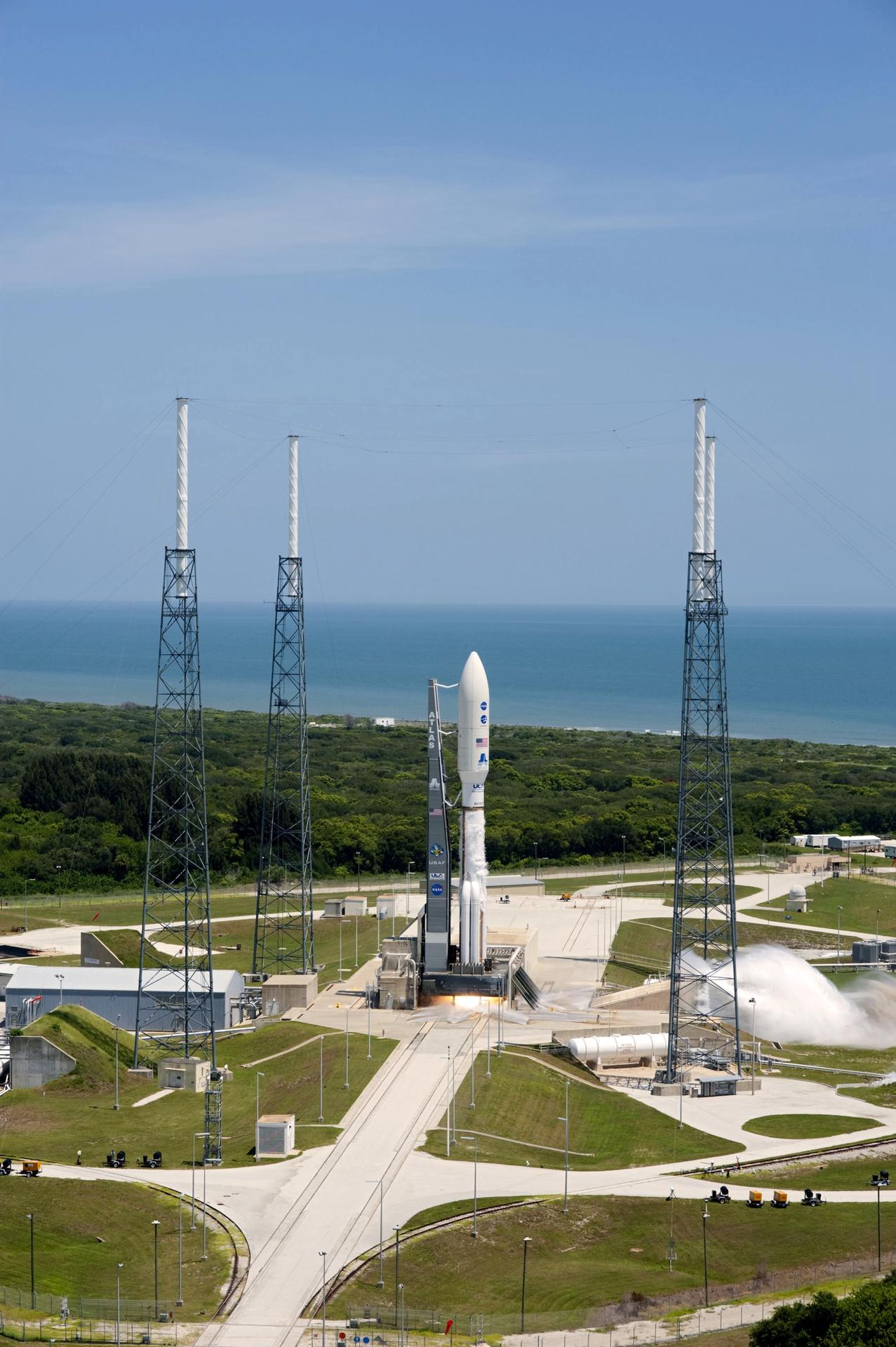 CAPE CANAVERAL, Fla. -- Backdropped by the Atlantic Ocean and surrounded by its four-tower lightning protection system, NASA's Juno planetary probe, enclosed in its payload fairing, is seconds away from liftoff atop a United Launch Alliance Atlas V rocket. Leaving from Space Launch Complex 41 on Cape Canaveral Air Force Station in Florida, the spacecraft will embark on a five-year journey to Jupiter. On the right, water is seen dumping into a flame trench to suppress vibrations at launch. Liftoff was at 12:25 p.m. EDT Aug. 5. The solar-powered spacecraft will orbit Jupiter's poles 33 times to find out more about the gas giant's origins, structure, atmosphere and magnetosphere and investigate the existence of a solid planetary core. For more information, visit www.nasa.gov/juno. Photo credit: NASA/Tony Gray and Tim Powers