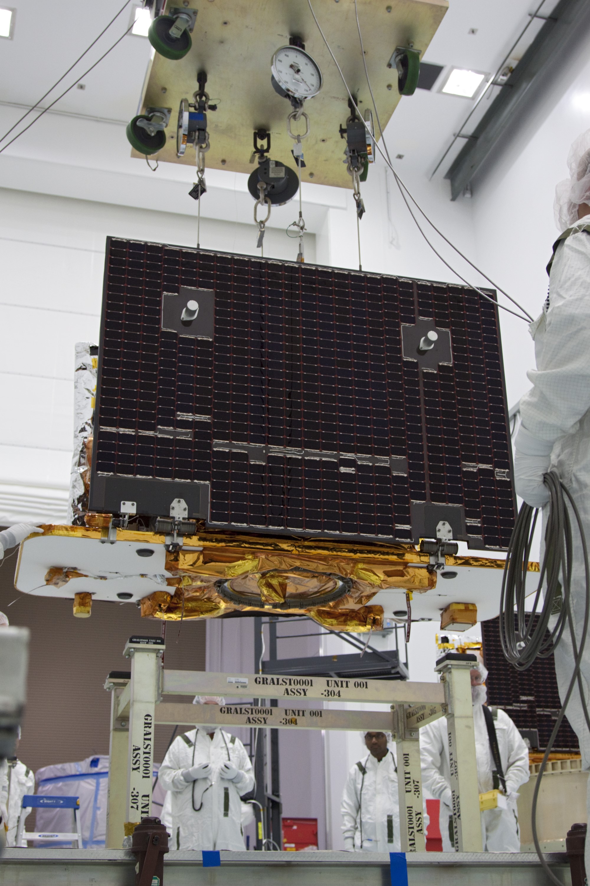CAPE CANAVERAL, Fla. -- At Astrotech Space Operation's payload processing facility in Titusville, Fla., NASA's Gravity Recovery and Interior Laboratory-A (GRAIL-A) lunar probe is lifted from its workstand. After the twin GRAIL spacecraft are attached to the adapter ring in their side-by-side launch configuration, they will be transported to the launch pad. GRAIL will fly in tandem orbits around the moon for several months to measure its gravity field. GRAIL's primary science objectives are to determine the structure of the lunar interior, from crust to core, and to advance understanding of the thermal evolution of the moon. Launch aboard a United Launch Alliance Delta II rocket from Space Launch Complex 17B on Cape Canaveral Air Force Station is scheduled for Sept. 8. For more information, visit http://www.nasa.gov/grail. Photo credit: NASA/Jim Grossmann