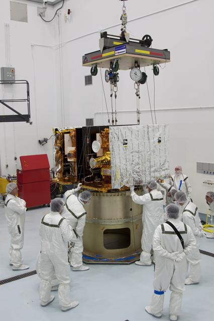 CAPE CANAVERAL, Fla. -- At Astrotech Space Operation's payload processing facility in Titusville, Fla., Lockheed Martin technicians adjust the position of NASA's Gravity Recovery and Interior Laboratory-A (GRAIL-A) lunar probe on the spacecraft adapter ring. GRAIL-B is already secured to the ring, at left. After the twin GRAIL spacecraft are attached to the adapter ring in their side-by-side launch configuration, they will be transported to the launch pad. GRAIL will fly in tandem orbits around the moon for several months to measure its gravity field. GRAIL's primary science objectives are to determine the structure of the lunar interior, from crust to core, and to advance understanding of the thermal evolution of the moon. Launch aboard a United Launch Alliance Delta II rocket from Space Launch Complex 17B on Cape Canaveral Air Force Station is scheduled for Sept. 8. For more information, visit http://www.nasa.gov/grail. Photo credit: NASA/Jim Grossmann