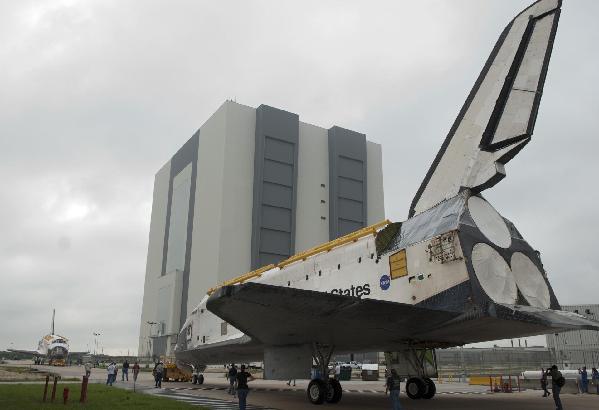 CAPE CANAVERAL, Fla. -- At NASA's Kennedy Space Center in Florida, space shuttles Discovery, at right, and Endeavour pause outside Orbiter Processing Facility-3 (OPF-3) for a unique "nose-to-nose" photo opportunity. Discovery, which temporarily was being stored in the Vehicle Assembly Building (VAB), is switching places with Endeavour, which has been undergoing decommissioning in OPF-1. Discovery then will be rolled into OPF-1 and Endeavour into the VAB. In OPF-1, Discovery will undergo further preparations for public display at the Smithsonian's National Air and Space Museum Steven F. Udvar-Hazy Center in Virginia. Endeavour will be stored in the VAB until October when it will be moved into OPF-2 for further work to get it ready for public display at the California Science Center in Los Angeles. For more information, visit http://www.nasa.gov/shuttle. Photo credit: NASA/Jim Grossmann