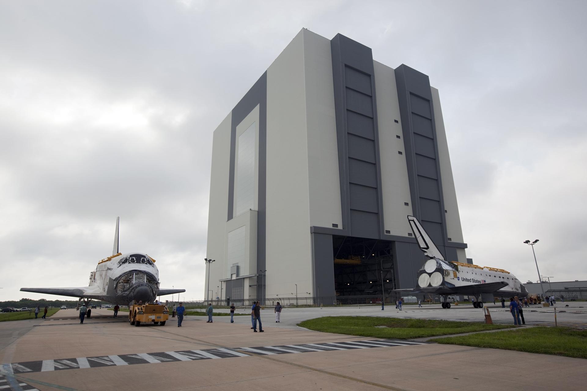 CAPE CANAVERAL, Fla. -- At NASA's Kennedy Space Center in Florida, space shuttles Discovery and Endeavour continue on their separate ways outside Orbiter Processing Facility-3 (OPF-3) where they paused for a unique "nose-to-nose" photo opportunity. Discovery, which temporarily was being stored in the Vehicle Assembly Building (VAB), is switching places with Endeavour, which has been undergoing decommissioning in OPF-1. Discovery will be rolled into OPF-1 and Endeavour into the VAB. In OPF-1, Discovery will undergo further preparations for public display at the Smithsonian's National Air and Space Museum Steven F. Udvar-Hazy Center in Virginia. Endeavour will be stored in the VAB until October when it will be moved into OPF-2 for further work to get it ready for public display at the California Science Center in Los Angeles. For more information, visit http://www.nasa.gov/shuttle. Photo credit: NASA/Dimitri Gerondidakis