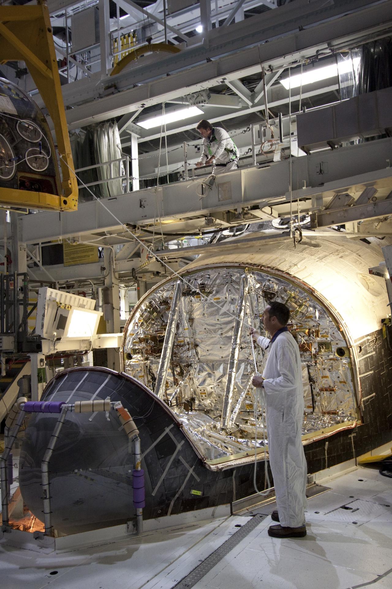 CAPE CANAVERAL, Fla. -- In Orbiter Processing Facility-2 (OPF-2) at NASA’s Kennedy Space Center in Florida, technicians monitor the progress of a special crane as it lifts the forward reaction control system away from space shuttle Atlantis. The system provided some of the maneuvering capabilities to the spacecraft during its missions. Atlantis glided to a landing, July 21, 2011, at Kennedy Space Center’s Shuttle Landing Facility, completing NASA’s final space shuttle mission, STS-135. The shuttle is in OPF-2 being decommissioned and prepared for eventual display at the Kennedy Space Center Visitor Complex in Florida. Photo credit: Jim Grossmann