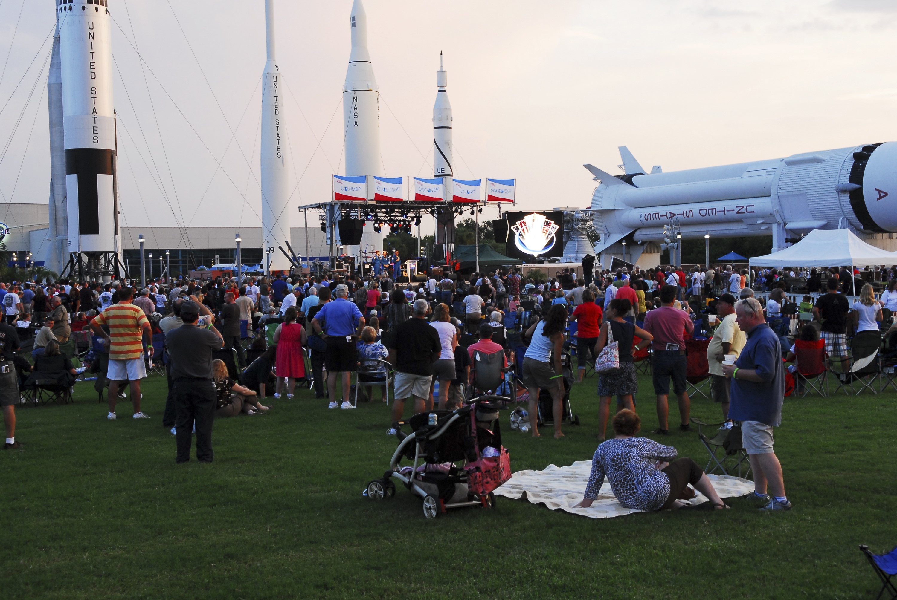 CAPE CANAVERAL, Fla. -- Thousands of space shuttle workers and their families gather near the Rocket Garden at the Kennedy Space Center Visitor Complex in Florida for the “We Made History! Shuttle Program Celebration” on Aug. 13. The event was held to honor current and former workers’ dedication to NASA’s Space Shuttle Program and to celebrate 30 years of space shuttle achievements. The event featured food, music, entertainment, astronaut appearances, educational activities, giveaways, and Starfire Night Skyshow. Photo credit: Jim Grossmann