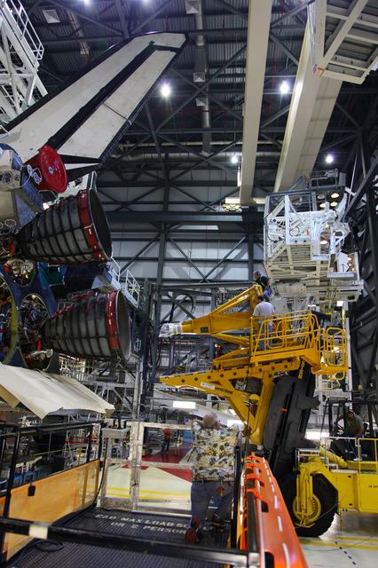 CAPE CANAVERAL, Fla. -- In Orbiter Processing Facility-2 at NASA’s Kennedy Space Center in Florida, a technician moves a Hyster forklift toward Engine #3 on space shuttle Atlantis. The forklift will be used to remove the engine and transport it to the Engine Shop for possible future use. Each of the three space shuttle main engines is 14 feet long and weighs 7,800 pounds. Removal of the space shuttle main engines is part of the Transition and Retirement work that is being performed in order to prepare Atlantis for eventual display at the Kennedy Space Center Visitor Complex in Florida. Photo credit: Frankie Martin