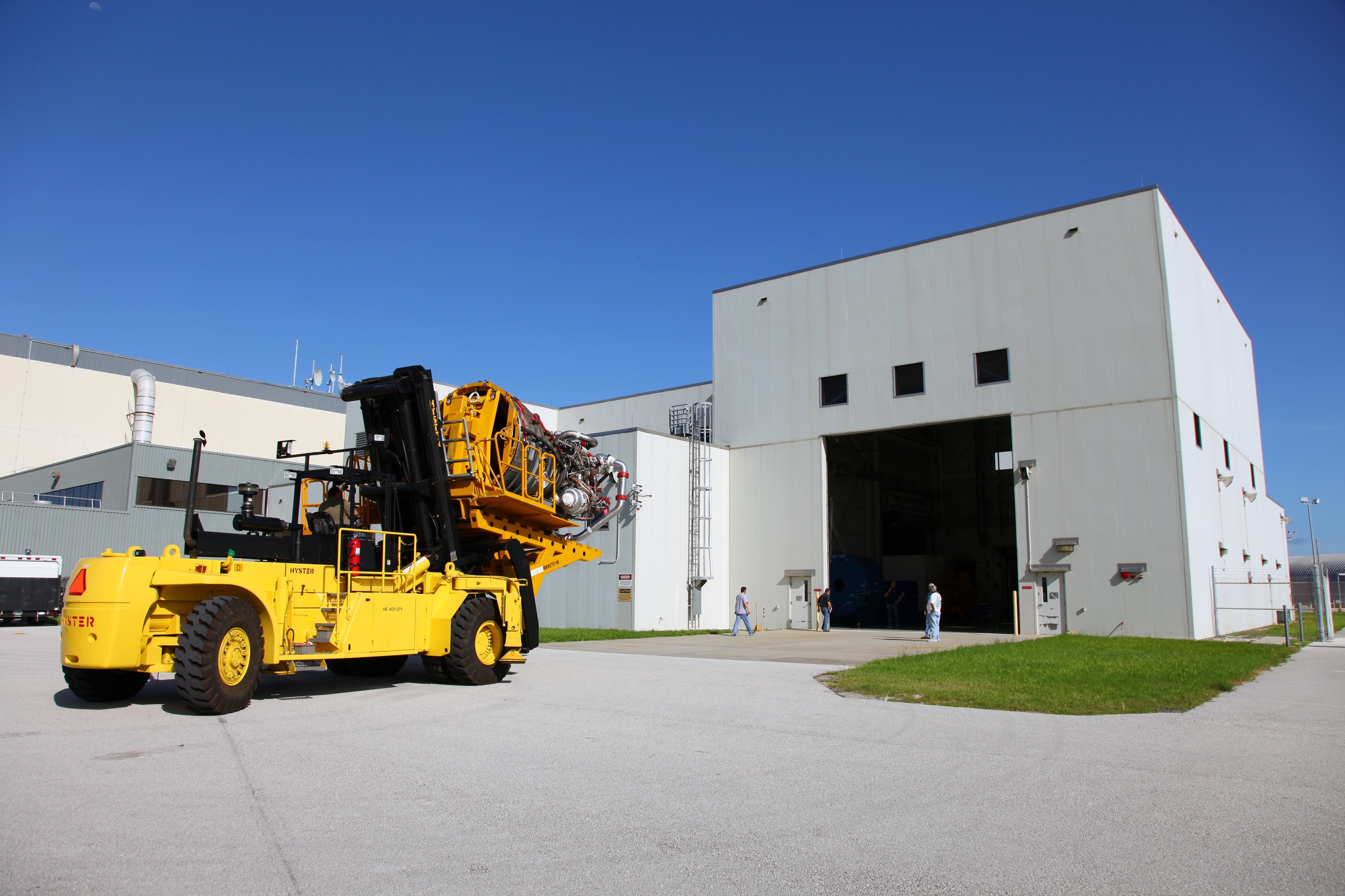 CAPE CANAVERAL, Fla. -- Technicians use a Hyster forklift to transport Engine #3 to the Engine Shop for possible future use after it was removed from space shuttle Atlantis in Orbiter Processing Facility-2 at NASA’s Kennedy Space Center in Florida. Each of the three space shuttle main engines is 14 feet long and weighs 7,800 pounds. Removal of the space shuttle main engines is part of the Transition and Retirement work that is being performed in order to prepare Atlantis for eventual display at the Kennedy Space Center Visitor Complex in Florida. Photo credit: Frankie Martin