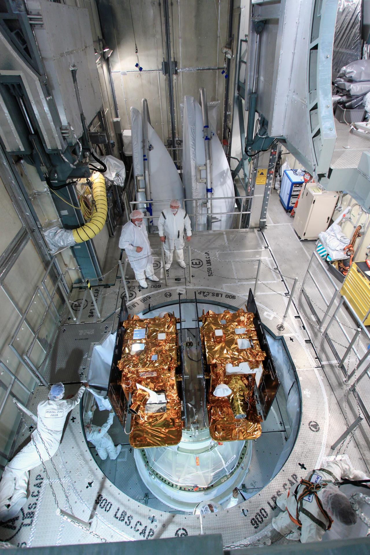 CAPE CANAVERAL, Fla. -- At Space Launch Complex 17B on Cape Canaveral Air Force Station in Florida, NASA's twin Gravity Recovery and Interior Laboratory spacecraft are uncovered and ready for enclosure in the Delta payload fairing. The fairing will protect the spacecraft from the impact of aerodynamic pressure and heating during ascent and will be jettisoned once the spacecraft is outside the Earth's atmosphere. Launch aboard a United Launch Alliance Delta II rocket from Pad 17B is scheduled for Sept. 8. The spacecraft will fly in tandem orbits around the moon for several months to measure its gravity field. GRAIL's primary science objectives are to determine the structure of the lunar interior, from crust to core, and to advance understanding of the thermal evolution of the moon. For more information, visit http://www.nasa.gov/grail. Photo credit: NASA/Jim Grossmann