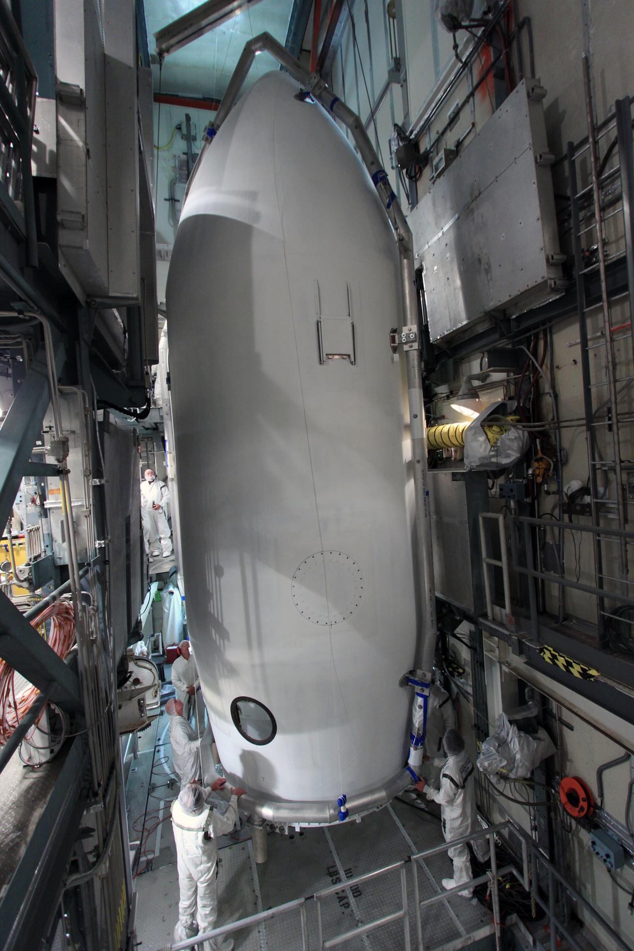 CAPE CANAVERAL, Fla. -- At Space Launch Complex 17B on Cape Canaveral Air Force Station in Florida, the sections of the Delta payload fairing form a protective cocoon around NASA's twin Gravity Recovery and Interior Laboratory spacecraft. The fairing will protect the spacecraft from the impact of aerodynamic pressure and heating during ascent and will be jettisoned once the spacecraft is outside the Earth's atmosphere. Launch aboard a United Launch Alliance Delta II rocket from Pad 17B is scheduled for Sept. 8. The spacecraft will fly in tandem orbits around the moon for several months to measure its gravity field. GRAIL's primary science objectives are to determine the structure of the lunar interior, from crust to core, and to advance understanding of the thermal evolution of the moon. For more information, visit http://www.nasa.gov/grail. Photo credit: NASA/Jim Grossmann