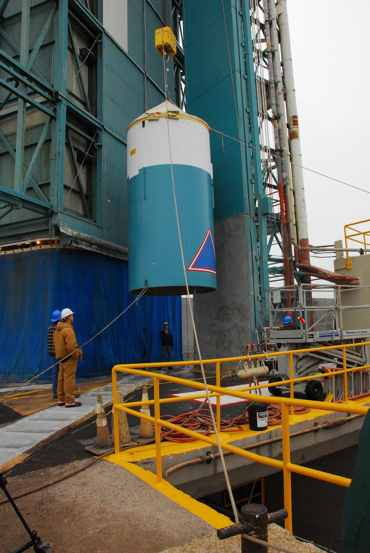 VANDENBERG AIR FORCE BASE, Calif. -- At Vandenberg Air Force Base in California, the interstage of the United Launch Alliance Delta II that will carry NASA's National Polar-orbiting Operational Environmental Satellite System Preparatory Project (NPP) satellite into space is lifted up the side of NASA's Space Launch Complex-2. The interstage provides an interface between the launch vehicle's first and second stages. NPP represents a critical first step in building the next-generation of Earth-observing satellites. NPP will carry the first of the new sensors developed for this satellite fleet, now known as the Joint Polar Satellite System (JPSS) to be launched in 2016. NPP is the bridge between NASA's Earth Observing System (EOS) satellites and the forthcoming series of JPSS satellites. The mission will test key technologies and instruments for the JPSS missions. For more information, visit http://www.nasa.gov/NPP. Photo credit: NASA/VAFB, Rudy Bledsoe