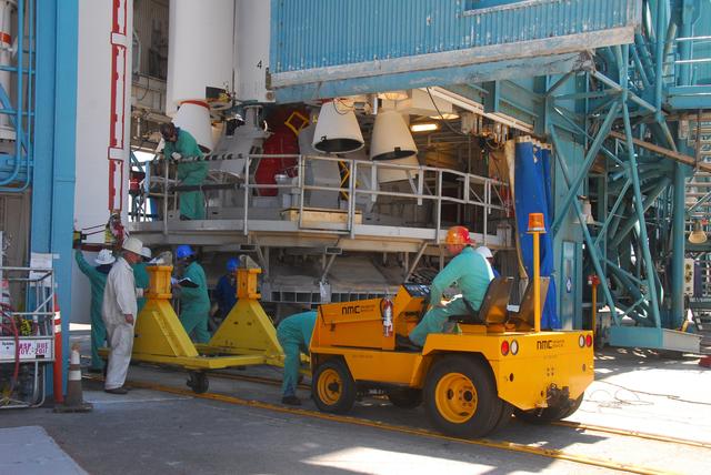 VANDENBERG AIR FORCE BASE, Calif. -- At Space Launch Complex-2 at Vandenberg Air Force Base in California, technicians monitor the progress as a crane lifts a solid rocket motor for the United Launch Alliance Delta II rocket. The Delta II will carry NASA’s National Polar-orbiting Operational Environmental Satellite System Preparatory Project (NPP) satellite into space. NPP represents a critical first step in building the next-generation of Earth-observing satellites. NPP will carry the first of the new sensors developed for this satellite fleet, now known as the Joint Polar Satellite System (JPSS) to be launched in 2016. NPP is the bridge between NASA's Earth Observing System (EOS) satellites and the forthcoming series of JPSS satellites. The mission will test key technologies and instruments for the JPSS missions. NPP is targeted to launch Oct. 25. For more information, visit http://www.nasa.gov/NPP. Photo credit: NASA/VAFB, Mark Mackley