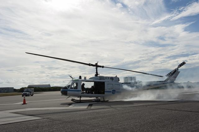 CAPE CANAVERAL, Fla. -- Smoke billows from a Huey II helicopter supporting the aviation safety exercise during Emergency Response Safety Training at the Shuttle Landing Facility, Runway 33, at NASA’s Kennedy Space Center in Florida. The simulated helicopter mishap exercise was conducted to evaluate emergency response and mishap investigations of aircraft at Kennedy. Participants included Air Rescue Fire Fighters, Flight Operations, Disaster Preparedness, Security, and Safety. NASA mandates simulated aviation safety training take place every two years. Photo credit: NASA/Kim Shiflett