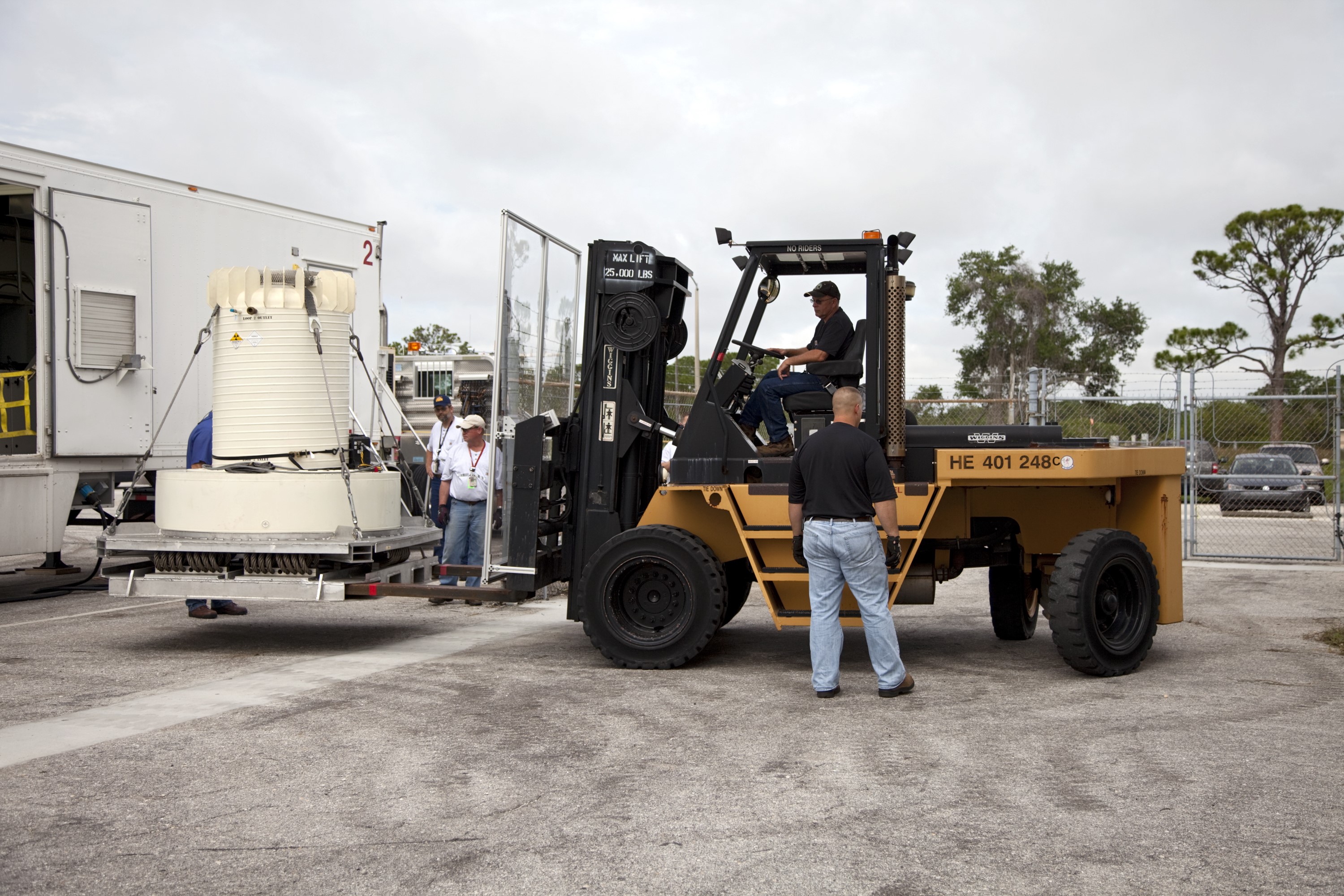 CAPE CANAVERAL, Fla. -- Workers use a forklift to offload the shipping cask enclosing the multi-mission radioisotope thermoelectric generator (MMRTG) for NASA's Mars Science Laboratory mission from the MMRTG trailer that delivered it to the RTG storage facility at NASA's Kennedy Space Center in Florida. The MMRTG will generate the power needed for the mission from the natural decay of plutonium-238, a non-weapons-grade form of the radioisotope. Heat given off by this natural decay will provide constant power through the day and night during all seasons. Waste heat from the MMRTG will be circulated throughout the rover system to keep instruments, computers, mechanical devices and communications systems within their operating temperature ranges. MSL's components include a compact car-sized rover, Curiosity, which has 10 science instruments designed to search for evidence on whether Mars has had environments favorable to microbial life, including chemical ingredients for life. The unique rover will use a laser to look inside rocks and release its gasses so that the rover’s spectrometer can analyze and send the data back to Earth. Launch of MSL aboard a United Launch Alliance Atlas V rocket is scheduled for Nov. 25 from Space Launch Complex 41 on Cape Canaveral Air Force Station in Florida. For more information, visit http://www.nasa.gov/msl. Photo credit: NASA/Frankie Martin