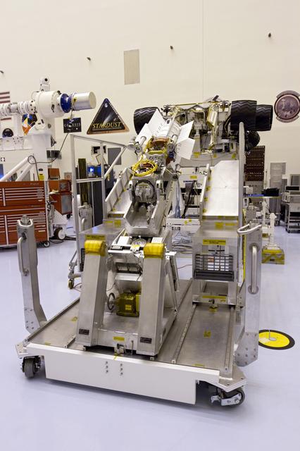 CAPE CANAVERAL, Fla. -- In the high bay of the Payload Hazardous Servicing Facility (PHSF) at NASA's Kennedy Space Center in Florida, the multi-mission radioisotope thermoelectric generator (MMRTG) for NASA's Mars Science Laboratory (MSL) mission is attached to the MMRTG integration cart. The cart will be used to install the MMRTG on the Curiosity rover for a fit check. The wheels of the rover appear to stick out on either side of the cart. The MMRTG will be installed on the rover for launch at the pad. The MMRTG will generate the power needed for the mission from the natural decay of plutonium-238, a non-weapons-grade form of the radioisotope. Heat given off by this natural decay will provide constant power through the day and night during all seasons. Curiosity, MSL's car-sized rover, has 10 science instruments designed to search for signs of life, including methane, and help determine if the gas is from a biological or geological source. Waste heat from the MMRTG will be circulated throughout the rover system to keep instruments, computers, mechanical devices and communications systems within their operating temperature ranges. Launch of MSL aboard a United Launch Alliance Atlas V rocket is planned for Nov. 25 from Space Launch Complex 41 on Cape Canaveral Air Force Station. For more information, visit http://www.nasa.gov/msl. Photo credit: NASA/Cory Huston