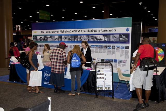 CAPE CANAVERAL, Fla. -- Education specialists at a joint exhibit from NASA's Kennedy Space Center and Glenn Research Center discuss the advancements the agency has made in aeronautics with the nationwide attendees of the Tom Joyner Family Reunion. The event was held in the Exhibit Hall of the Gaylord Palms Resort and Convention Center in Kissimmee, Fla., and hosted by nationally syndicated radio personality Tom Joyner during the extended Labor Day weekend Sept. 1-4. Besides offering attendees the opportunity to visit tourist attractions in the Orlando area, the reunion gave NASA an avenue to tout the benefits of math and scientific learning, as well as the many educational opportunities offered by the space agency. For more information on NASA's education initiatives, visit http://www.nasa.gov/education. Photo credit: NASA/Frankie Martin