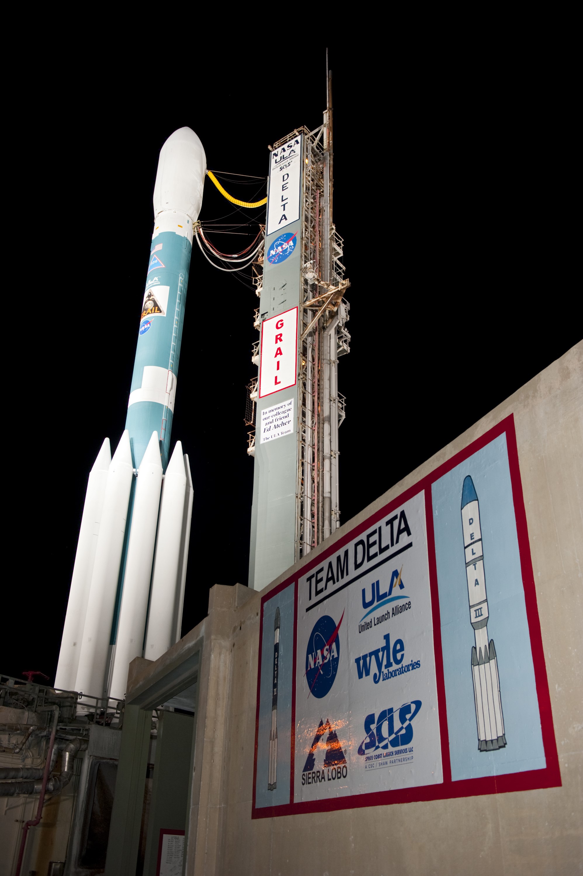 CAPE CANAVERAL, Fla. -- At Space Launch Complex 17B on Cape Canaveral Air Force Station, the United Launch Alliance Delta II rocket that will launch NASA's Gravity Recovery and Interior Laboratory mission towers over the logos painted on the pad's structure of the companies comprising the launch team. The mobile service tower has been rolled away from the vehicle for launch. The "rollback" began at about 11:20 p.m. EDT Sept. 7. GRAIL will fly twin spacecraft in tandem around the moon to precisely measure and map variations in the moon's gravitational field. The mission will provide the most accurate global gravity field to date for any planet, including Earth. This detailed information will reveal differences in the density of the moon's crust and mantle and will help answer fundamental questions about the moon's internal structure, thermal evolution, and history of collisions with asteroids. The aim is to map the moon's gravity field so completely that future lunar vehicles can safely navigate anywhere on the moon’s surface. Launch is scheduled for 8:37:06 a.m. EDT Sept. 8. For more information, visit http://www.nasa.gov/grail. Photo credit: NASA/Kim Shiflett
