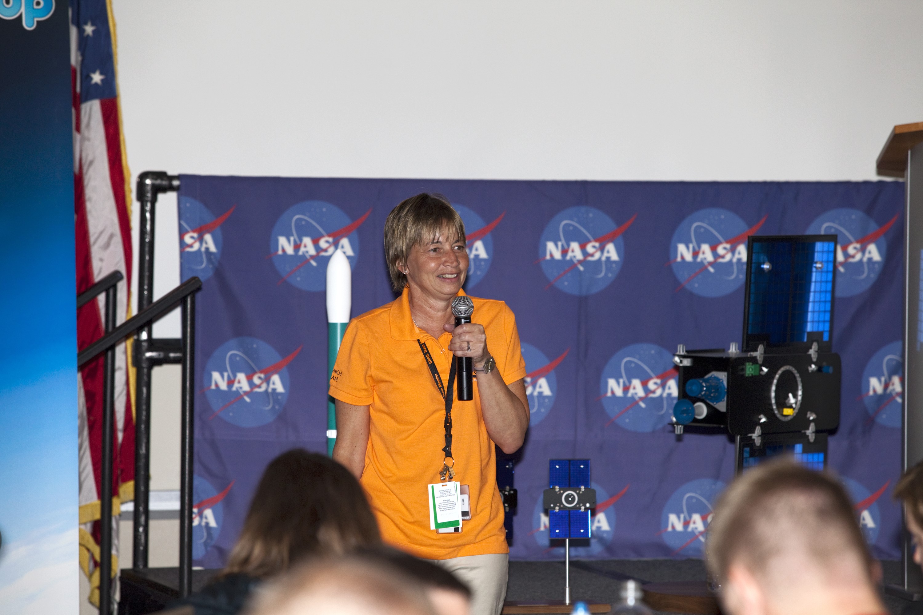 CAPE CANAVERAL, Fla. – Maria Zuber, GRAIL principal investigator at the Massachusetts Institute of Technology in Cambridge, speaks to a group of Tweetup participants at the Kennedy Space Center Visitor Complex in Florida during prelaunch activities for NASA's Gravity Recovery and Interior Laboratory (GRAIL) mission. Participants toured NASA’s Kennedy Space Center and got a close-up view of Space Launch Complex 17B at Cape Canaveral Air Force Station. The tweeters will share their experiences with followers through the social networking site Twitter. GRAIL will fly twin spacecraft in tandem around the moon to precisely measure and map variations in the moon’s gravitational field. The mission will provide the most accurate global gravity field to date for any planet, including Earth. This detailed information will reveal differences in the density of the moon’s crust and mantle and will help answer fundamental questions about the moon’s internal structure, thermal evolution, and history of collisions with asteroids. The aim is to map the moon’s gravity field so completely that future lunar vehicles can safely navigate anywhere on the moon’s surface. Launch is scheduled for 8:37:06 a.m. EDT Sept. 8. For more information, visit http://www.nasa.gov/grail. Photo credit: NASA/Gianni Woods