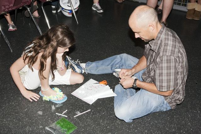 CAPE CANAVERAL, Fla. – A father helps his daughter with an educational activity at Kennedy Space Center’s Family Night, Sept. 10, at the U.S. Astronaut Hall of Fame in Florida. NASA and the Kennedy Space Center Visitor Complex hosted the annual NASA family education night. The event, for fifth- through eighth-grade students and their parents, focuses on science, technology, engineering and mathematics (STEM) education activities that included astronaut appearances, a hovercraft, vortex cannon and alternative fuel vehicles. The back-to-school event is part of NASA’s Summer of Innovation initiative to provide interactive learning experiences to middle school students nationwide. Photo credit: NASA/Amanda Diller