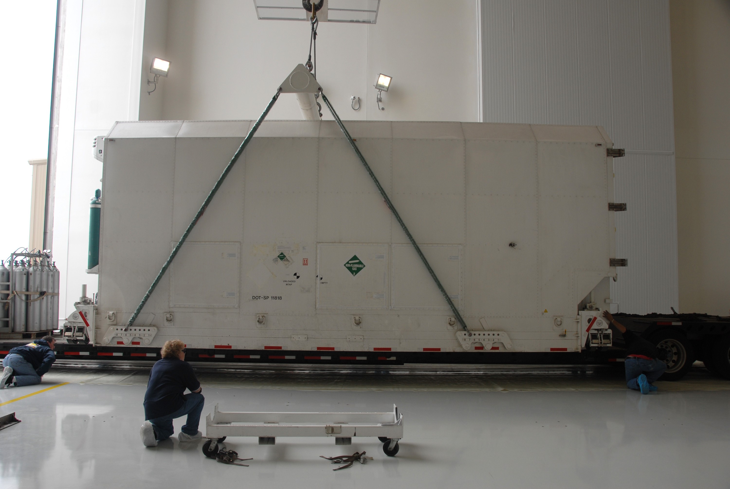 VANDENBERG AIR FORCE BASE, Calif. – In the Astrotech Payload Processing Facility at Vandenberg Air Force Base in California, technicians attach a crane to the container holding NASA’s National Polar-orbiting Operational Environmental Satellite System Preparatory Project (NPP). NPP represents a critical first step in building the next-generation of Earth-observing satellites. NPP will carry the first of the new sensors developed for this satellite fleet, now known as the Joint Polar Satellite System (JPSS), to be launched in 2016. NPP is the bridge between NASA’s Earth Observing System (EOS) satellites and the forthcoming series of JPSS satellites. The mission will test key technologies and instruments for the JPSS missions. NPP is targeted to launch Oct. 25 from Space Launch Complex-2 aboard a United Launch Alliance Delta II rocket. For more information, visit http://www.nasa.gov/NPP. Photo credit: NASA/30th Communications Squadron, VAFB