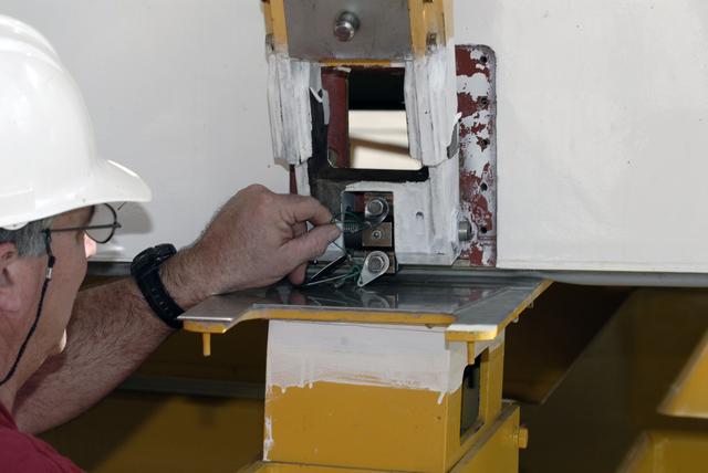 CAPE CANAVERAL, Fla. – At the Vehicle Assembly Building at NASA's Kennedy Space Center in Florida, a worker connects an aerial lift to the Approach and Landing Test Assembly (ALTA) pod. The lift will be used to raise the ALTA pod onto space shuttle Endeavour. The demonstration test is being conducted to ensure the center’s equipment will fit into the hangar at the National Air and Space Museum when installing an ALTA pod on shuttle Enterprise. The pod must be reinstalled on a shuttle for transport on a 747 carrier aircraft. The simulation also tests procedures and timelines necessary to carry out the process. The work is part of the Space Shuttle Program’s transition and retirement processing. Enterprise, which was not equipped for space flight, was built as a test vehicle to demonstrate that the orbiter could fly in the atmosphere and land like an airplane. In 1985, Enterprise was ferried from the Kennedy Space Center to Dulles Airport, Washington, D.C., and became the property of the Smithsonian Institute. Enterprise will be moved from the Smithsonian Institution National Air and Space Museum's Steven F. Udvar-Hazy Center in Chantilly, Va., to the Intrepid Sea, Air and Space Museum in New York. For more information, visit http://www.nasa.gov/shuttle. Photo credit: NASA/Ken Shiflett