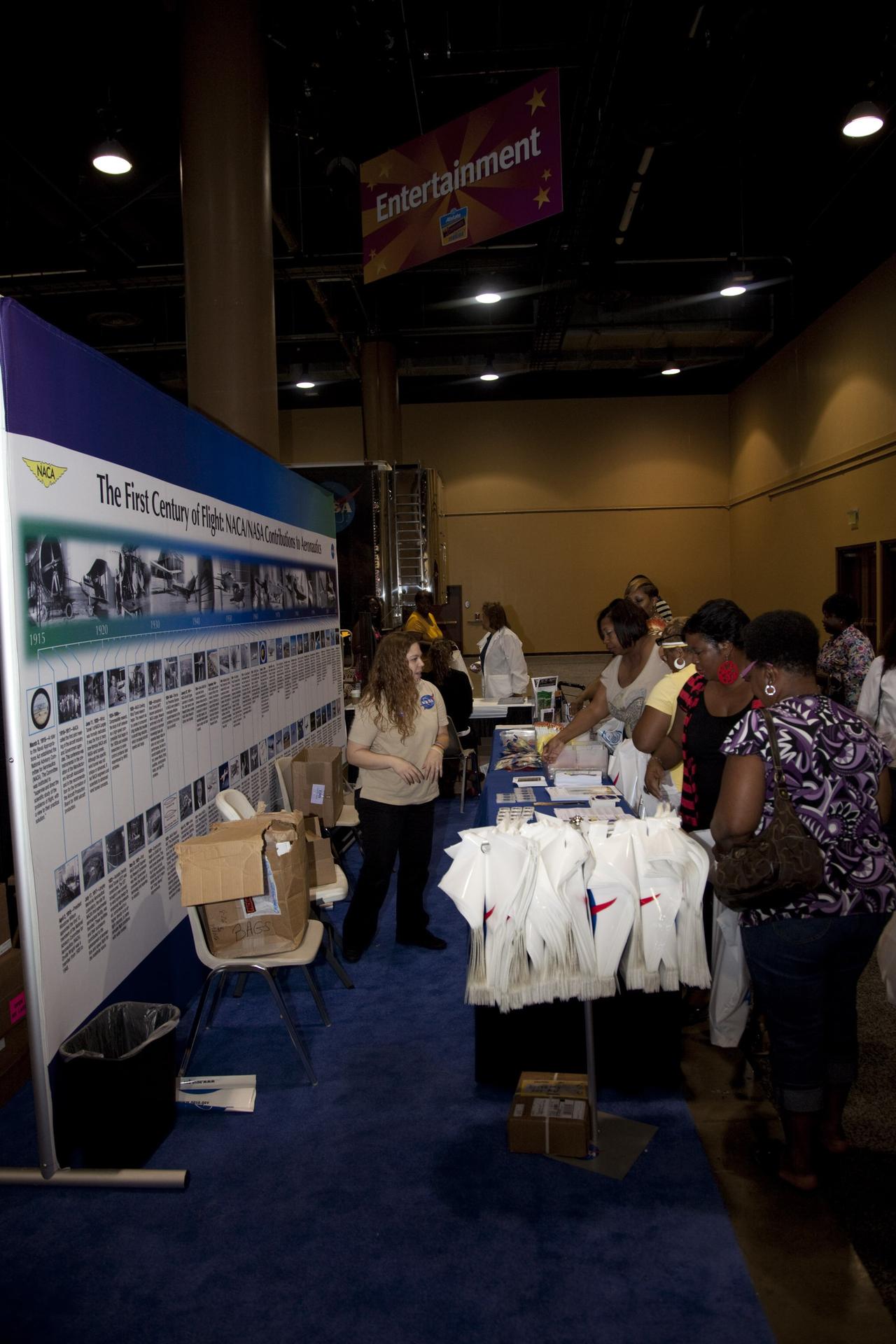 CAPE CANAVERAL, Fla. -- Education specialists at a joint exhibit from NASA's Kennedy Space Center and Glenn Research Center discuss the advancements the agency has made in aeronautics with the nationwide attendees of the Tom Joyner Family Reunion. The event was held in the Exhibit Hall of the Gaylord Palms Resort and Convention Center in Kissimmee, Fla., and hosted by nationally syndicated radio personality Tom Joyner during the extended Labor Day weekend Sept. 1-4. Besides offering attendees the opportunity to visit tourist attractions in the Orlando area, the reunion gave NASA an avenue to tout the benefits of math and scientific learning, as well as the many educational opportunities offered by the space agency. For more information on NASA's education initiatives, visit http://www.nasa.gov/education. Photo credit: NASA/Frankie Martin
