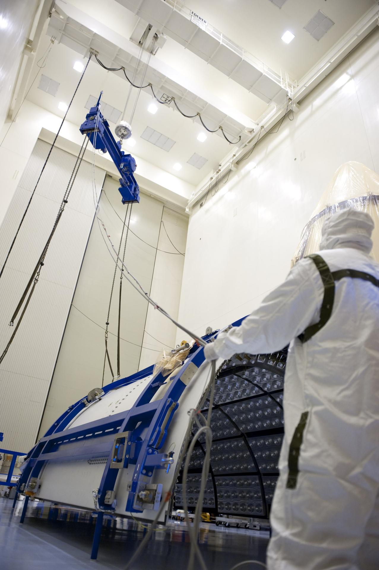 CAPE CANAVERAL, Fla. -- In the Payload Hazardous Servicing Facility at NASA's Kennedy Space Center in Florida, United Launch Alliance technicians lower a lifting device toward half of the Atlas V payload fairing for NASA's Mars Science Laboratory (MSL) mission. The fairing has been uncovered, and preparations are under way to clean it to meet NASA's planetary protection requirements. The fairing will protect the spacecraft from the impact of aerodynamic pressure and heating during ascent. Although jettisoned once the spacecraft is outside the Earth's atmosphere, the fairing must be cleaned to the same exacting standards as the laboratory to avoid the possibility of contaminating it. MSL's components include a compact car-sized rover, Curiosity, which has 10 science instruments designed to search for evidence on whether Mars has had environments favorable to microbial life, including the chemical ingredients for life. The unique rover will use a laser to look inside rocks and release its gasses so that the rover’s spectrometer can analyze and send the data back to Earth. Launch of MSL aboard a United Launch Alliance Atlas V rocket is planned for Nov. 25 from Space Launch Complex 41 on Cape Canaveral Air Force Station. For more information, visit http://www.nasa.gov/msl. Photo credit: NASA/Kim Shiflett