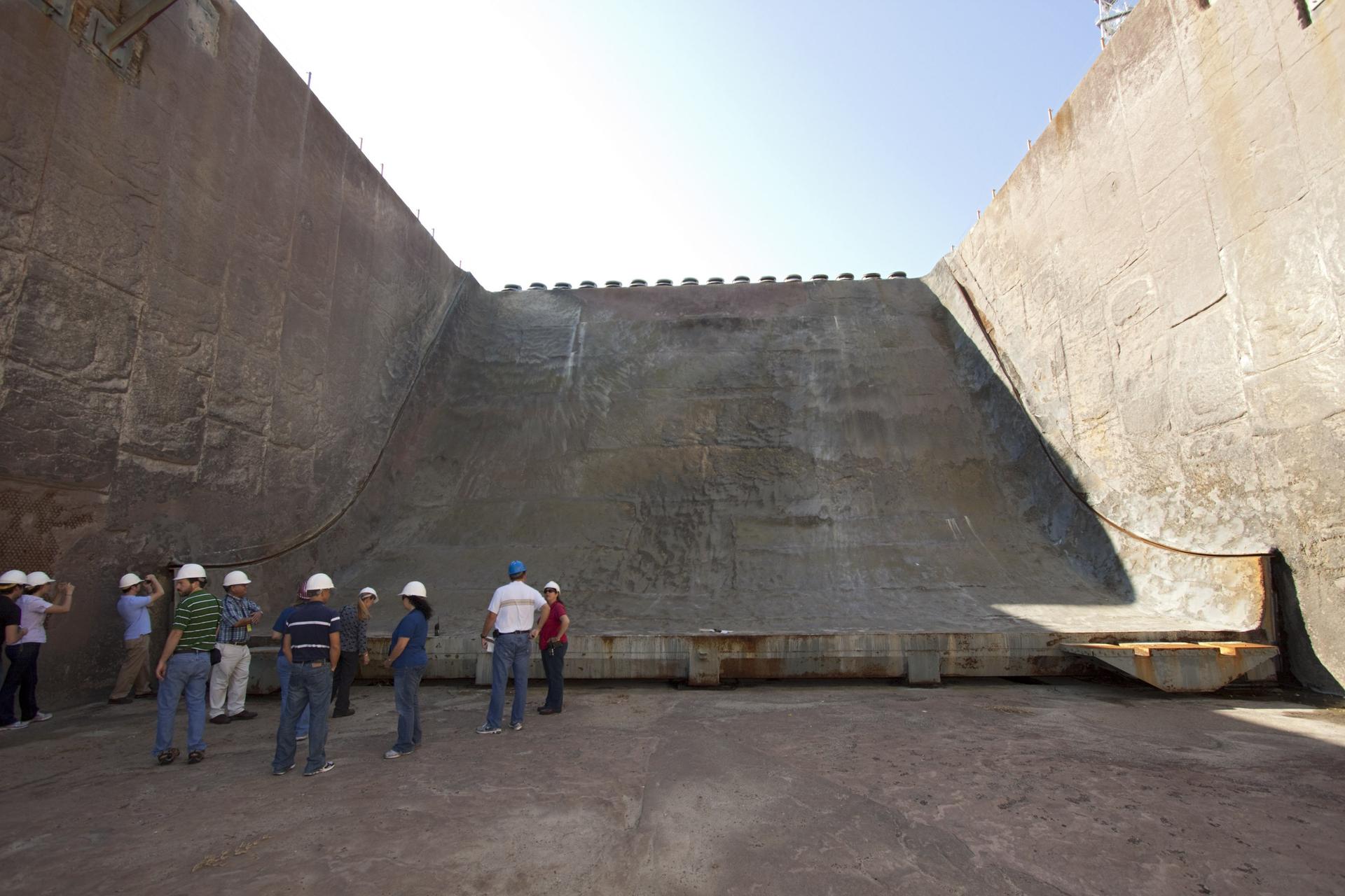 CAPE CANAVERAL, Fla. – Mechanical engineering students from Louisiana State University joined engineers and scientists at Launch Pad 39B at NASA's Kennedy Space Center in Florida as the students toured the facility to have a look at the flame trench. The students, standing on the flame deflector that divides the trench, signed up to help designers looking for new, flame and vibration-resistant materials to line the trench. The students are to build a scaled-down version of the flame trench that Kennedy's scientists can use to try out sample materials for the trench. If the samples work in the lab, they can be tried out in the real flame trenches at Launch Pad 39A and 39B. The launch pad has been refurbished extensively and work is continuing to modify the pad to support a variety of launch vehicles in the future. Photo credit: NASA/Jim Grossmann