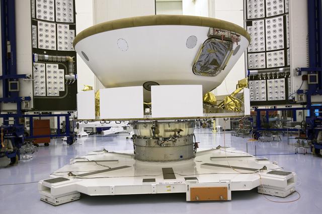 CAPE CANAVERAL, Fla. -- In the Payload Hazardous Servicing Facility at NASA's Kennedy Space Center in Florida, NASA's Mars Science Laboratory (MSL) is ready to be enclosed in the Atlas V rocket payload fairing in the background. The blocks on the interior of the fairing are components of the fairing acoustic protection (FAP) system, designed to protect the payload by dampening the sound created by the rocket during liftoff. The fairing will protect the spacecraft from the impact of aerodynamic pressure and heating during ascent. MSL's components include a compact car-sized rover, Curiosity, which has 10 science instruments designed to search for evidence on whether Mars has had environments favorable to microbial life, including the chemical ingredients for life. The unique rover will use a laser to look inside rocks and release its gasses so that the rover’s spectrometer can analyze and send the data back to Earth. Launch of MSL aboard a United Launch Alliance Atlas V rocket is planned for Nov. 25 from Space Launch Complex-41 on Cape Canaveral Air Force Station. For more information, visit http://www.nasa.gov/msl. Photo credit: NASA/Jim Grossmann