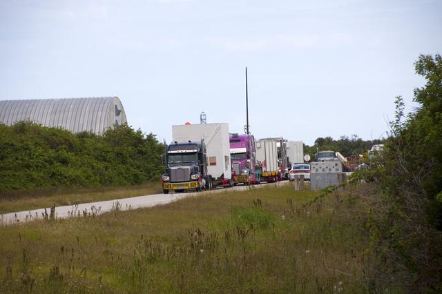 CAPE CANAVERAL, Fla. – Outside the Hazardous Maintenance Facility at NASA's Kennedy Space Center in Florida, space shuttle Endeavour’s left and right orbital maneuvering system (OMS) pods and forward reaction control system (FRCS) are secured in several containers and ready for transport to White Sands Space Harbor in New Mexico. The work is part of the Space Shuttle Program’s transition and retirement processing of shuttle Endeavour. At White Sands the OMS pods and FRCS will undergo a complete deservicing and cleaning and then be returned to Kennedy for reinstallation on Endeavour. Endeavour is being prepared for display at the California Science Center in Los Angeles. Photo credit: NASA/Jim Grossmann