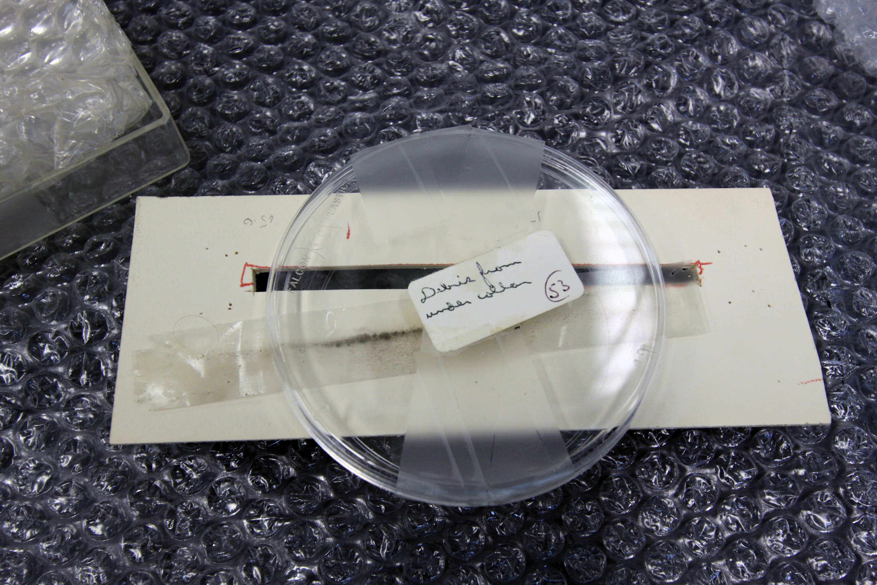CAPE CANAVERAL, Fla. – In the Granular Mechanics and Regolith Operations (GMRO) Lab at NASA's Kennedy Space Center in Florida, a piece of the Surveyor 3 spacecraft returned from the lunar surface on the Apollo 12 mission is available for examination by the lab's staff. The GMRO Lab is one of several labs located in NASA's Space Life Sciences Laboratory (SLSL) facility. The lab is staffed by three physicists, six mechanical or aerospace engineers and several technicians who are studying how the rocket exhaust of landing vehicles affects lunar and Martian science missions, including the sandblasting of instruments with soil and dust ejecta and the disturbance or contamination of soil beneath the lander. For more information on the GMRO Lab, see p. 7 of the Spaceport News dated Nov. 11, 2011, at http://www.nasa.gov/centers/kennedy/pdf/603285main_nov11-2011.pdf. Photo credit: NASA/Jim Grossmann