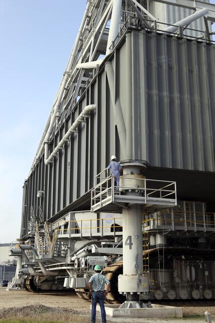 CAPE CANAVERAL, Fla. – At NASA’s Kennedy Space Center in Florida, the camera captures a unique view of the crawler-transporter as it is prepared to move the mobile launcher (ML) from next to Kennedy's Vehicle Assembly Building to Launch Pad 39B, a distance of 4.2 miles. Data on the ML will be collected from structural and functional engineering tests and used for the next phases of construction. The 355-foot-tall ML structure, which took about two years to construct, is being modified to support NASA’s Space Launch System (SLS), the heavy-lift rocket that will launch astronauts farther into space than ever before. SLS will also create high-quality jobs here at home, and provide the cornerstone for America's future human space exploration efforts. Photo credit: NASA/Dimitri Gerondidakis