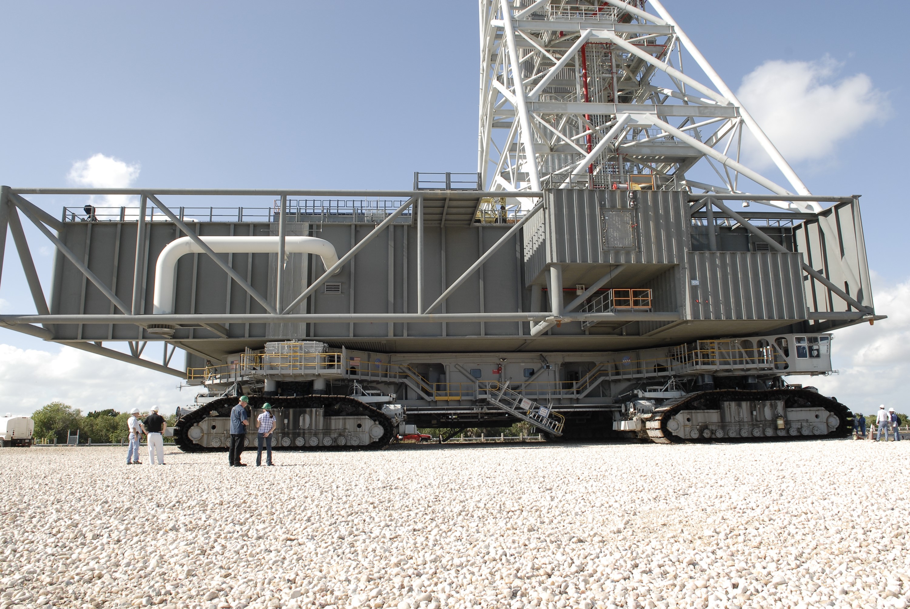 CAPE CANAVERAL, Fla. – On the crawlerway at NASA’s Kennedy Space Center in Florida, technicians confer before the crawler-transporter as it rolls out the mobile launcher (ML) from next to Kennedy's Vehicle Assembly Building to Launch Pad 39B, a distance of 4.2 miles. Rollout began at about 9:15 a.m. EST. Data on the ML will be collected from structural and functional engineering tests and used for the next phases of construction overseen by NASA’s 21st Century Ground Systems Program. The 355-foot-tall ML structure, which took about two years to construct, is being modified to support NASA’s Space Launch System (SLS), the heavy-lift rocket that will launch astronauts farther into space than ever before. SLS will also create high-quality jobs here at home, and provide the cornerstone for America's future human space exploration efforts. Photo credit: NASA/Charisse Nahser