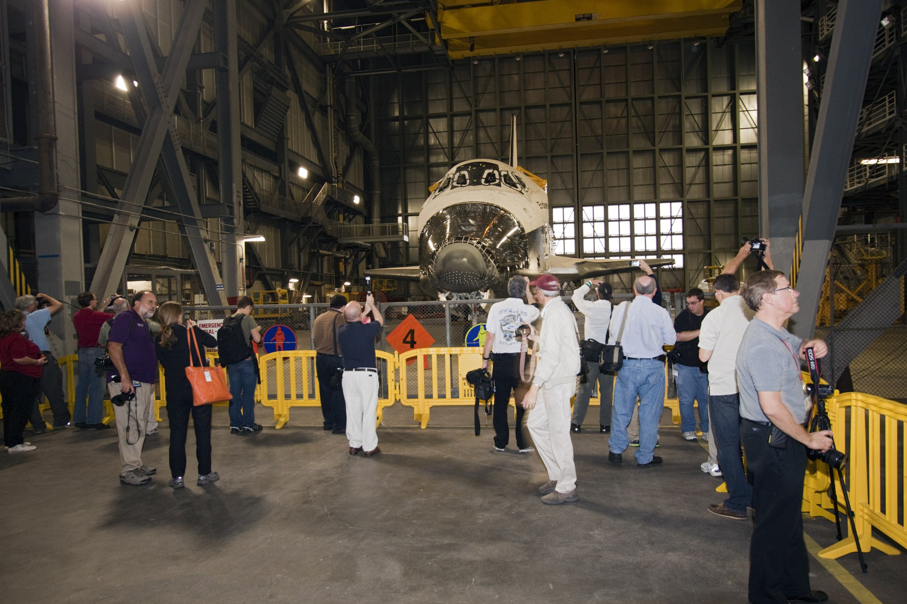CAPE CANAVERAL, Fla. – At NASA Kennedy Space Center in Florida, media representatives taking the 21st Century Ground Systems tour get a close-up look at space shuttle Endeavour which is being stored in the Vehicle Assembly Building. Other stops on the tour include a crawler-transporter parked on the crawlerway, the new mobile launcher on Launch Pad 39B, and the Launch Control Center's Firing Room 1. These facilities and equipment will be used to prepare and launch NASA's new Orion spacecraft on the Space Launch System heavy-lift rocket. The tour was arranged as part of prelaunch media activities for the agency's Mars Science Laboratory (MSL) launch. Liftoff of MSL aboard a United Launch Alliance Atlas V rocket from Space Launch Complex-41 on Cape Canaveral Air Force Station is planned during a launch window which extends from 10:02 a.m. to 11:45 a.m. EST on Nov. 26. For more information, visit http://www.nasa.gov/msl. Photo credit: NASA/Jim Grossmann