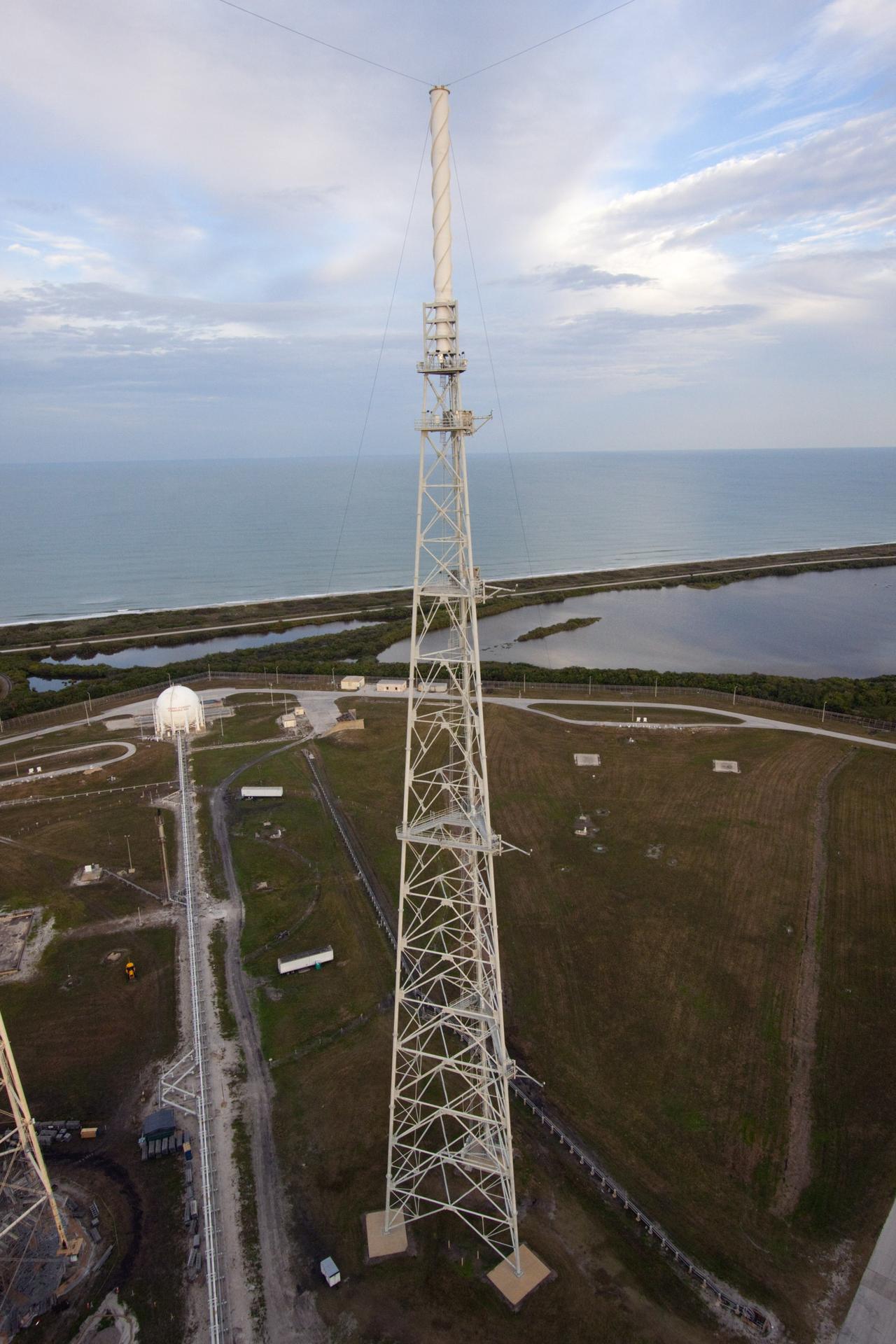 CAPE CANAVERAL, Fla. – At NASA Kennedy Space Center in Florida, this view, taken from the top of the 355-foot-tall mobile launcher at Launch Pad 39B, illustrates the close proximity of the pad to the Atlantic Ocean in the background. The structure in the center of the photo is one of three lightning masts at the pad. Media representatives are taking the 21st Century Ground Systems tour which also includes the Vehicle Assembly Building, a crawler-transporter parked on the crawlerway, and the Launch Control Center's Firing Room 1. These facilities and equipment will be used to prepare and launch NASA's new Orion spacecraft on the Space Launch System heavy-lift rocket. The tour was arranged as part of prelaunch media activities for the agency's Mars Science Laboratory (MSL) launch. Liftoff of MSL aboard a United Launch Alliance Atlas V rocket from Space Launch Complex-41 on Cape Canaveral Air Force Station is planned during a launch window which extends from 10:02 a.m. to 11:45 a.m. EST on Nov. 26. For more information, visit http://www.nasa.gov/msl. Photo credit: NASA/Jim Grossmann