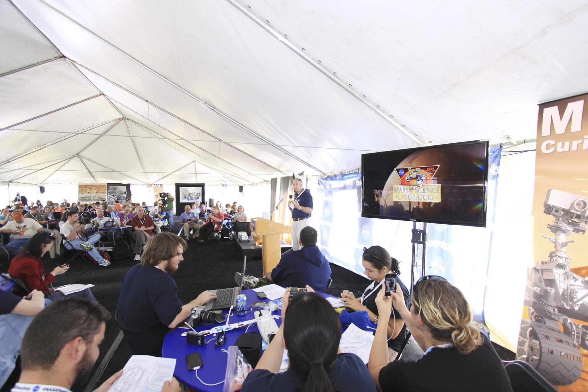 CAPE CANAVERAL, Fla. – Rex Engelhardt, mission manager in NASA's Launch Services Program at the NASA Kennedy Space Center, speaks to a group of Tweetup participants at Kennedy's Press Site in Florida during prelaunch activities for the agency’s Mars Science Laboratory (MSL) launch. Following a series of briefings, participants will tour the center and get a close-up view of Space Launch Complex-41 on Cape Canaveral Air Force Station. The tweeters will share their experiences with followers through the social networking site Twitter. MSL's components include a car-sized rover, Curiosity, which has 10 science instruments designed to search for signs of life, including methane, and help determine if the gas is from a biological or geological source. Liftoff of MSL aboard a United Launch Alliance Atlas V rocket from pad 41 is planned during a launch window which extends from 10:02 a.m. to 11:45 a.m. EST on Nov. 26. For more information, visit http://www.nasa.gov/msl. Photo credit: NASA/Jim Grossmann