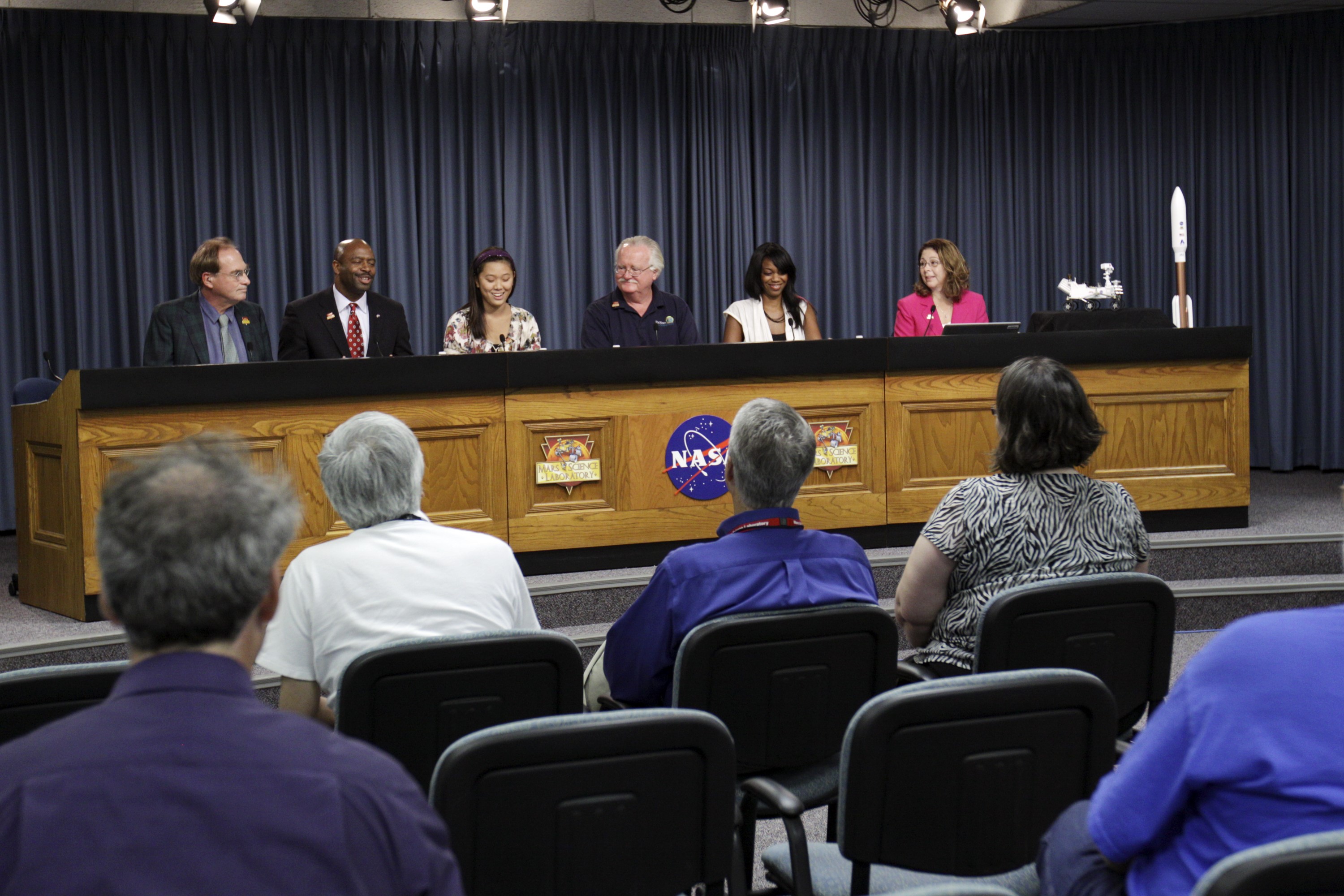 CAPE CANAVERAL, Fla. – An educational news conference to explore "Why Mars Excites and Inspires Us" is under way in NASA Kennedy Space Center's Press Site auditorium in Florida during prelaunch activities for the agency’s Mars Science Laboratory (MSL) launch. Participants are, from left, moderator George Diller, NASA Public Affairs, NASA Kennedy Space Center; Leland Melvin, NASA associate administrator for Education; Clara Ma, student, NASA contest winner for naming Curiosity, Shawnee Mission East High School, Prairie Village, Kansas; Scott Anderson, teacher and science department chairman, Da Vinci School for Science and the Arts, El Paso, Texas; Lauren Lyons, graduate student, Harvard University, FIRST robotics alumna; and Veronica McGregor, manager, Media Relations Office, NASA Jet Propulsion Laboratory. MSL's car-sized Martian rover, Curiosity, has 10 science instruments designed to search for signs of life, including methane, and help determine if the gas is from a biological or geological source. Ma's entry was selected the winner from 9,000 entries in NASA's nationwide student contest to name the rover. At the time, she was a twelve-year-old sixth-grade student at the Sunflower Elementary school in Lenexa, Kansas. Liftoff of MSL aboard a United Launch Alliance Atlas V rocket from Space Launch Complex-41 on Cape Canaveral Air Force Station is planned during a launch window which extends from 10:02 a.m. to 11:45 a.m. EST on Nov. 26. For more information, visit http://www.nasa.gov/msl. Photo credit: NASA/Kim Shiflett