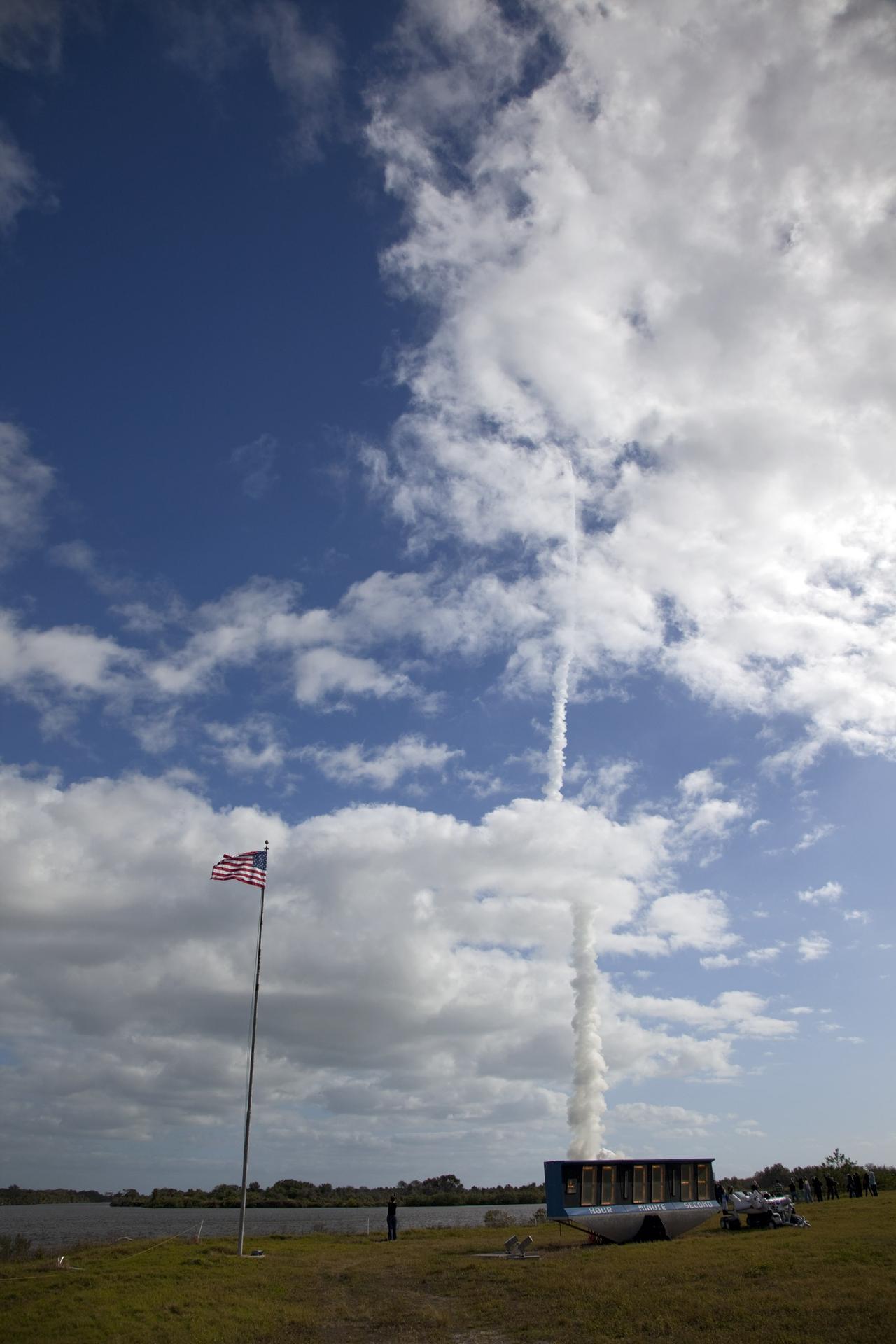 CAPE CANAVERAL, Fla. – At NASA Kennedy Space Center's Press Site in Florida, a U.S. flag flaps in the breeze next to the countdown clock at the turn basin. Overhead, the contrail of the United Launch Alliance Atlas V rocket, carrying the agency's Mars Science Laboratory (MSL) into space, dissects the clouds over Space Launch Complex-41 on neighboring Cape Canaveral Air Force Station. Liftoff came at 10:02 a.m. EST at the opening of the launch window. MSL's components include a car-sized rover, Curiosity, which has 10 science instruments designed to search for signs of life, including methane, and help determine if the gas is from a biological or geological source. For more information, visit http://www.nasa.gov/msl. Photo credit: NASA/Frankie Martin