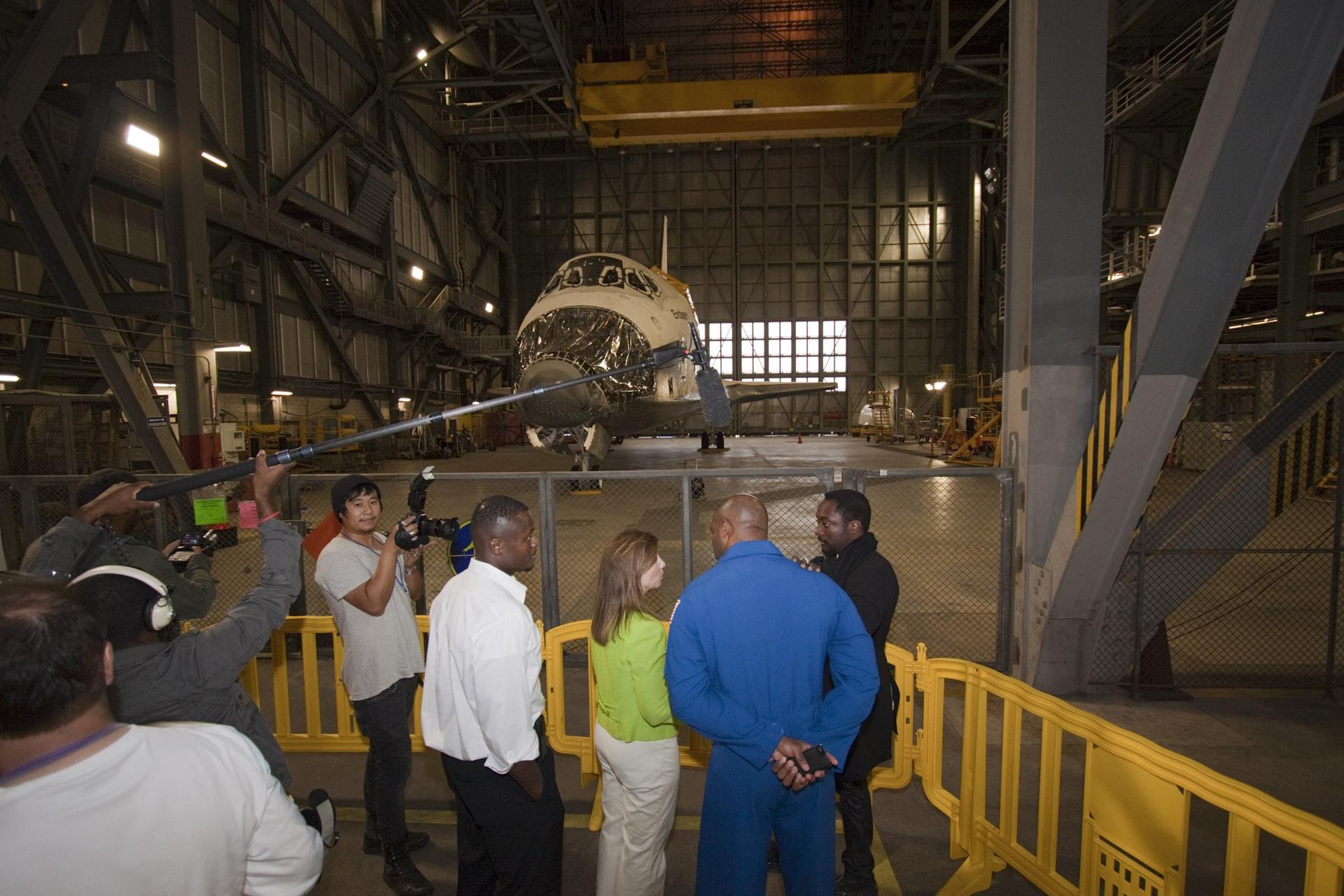 CAPE CANAVERAL, Fla. – At NASA Kennedy Space Center in Florida, presenters and Kennedy personnel supporting a NASA Tweetup get a close-up look at space shuttle Endeavour being stored in the Vehicle Assembly Building. From left are Yves Lamothe, lead systems engineer for the 21st Century Ground Systems Program at Kennedy; NASA Deputy Administrator Lori Garver; former astronaut Leland Melvin, NASA associate administrator for Education; and Will.i.am, entertainer and member of The Black Eyed Peas. The Tweetup is part of prelaunch activities for the agency’s Mars Science Laboratory (MSL) launch and provides the opportunity for tweeters will share their experiences with followers through the social networking site Twitter. The MSL mission will pioneer precision landing technology and a sky-crane touchdown to place a car-sized rover, Curiosity, near the foot of a mountain inside Gale Crater on Aug. 6, 2012. During a nearly two-year prime mission after landing, the rover will investigate whether the region has ever offered conditions favorable for microbial life, including the chemical ingredients for life. Liftoff of MSL aboard a United Launch Alliance Atlas V rocket from Space Launch Complex-41 on Cape Canaveral Air Force Station was at 10:02 a.m. EST on Nov. 26. For more information, visit http://www.nasa.gov/msl. Photo credit: NASA/Jim Grossmann