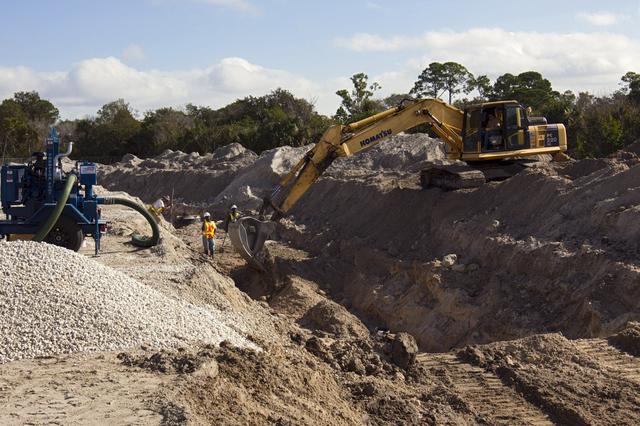 CAPE CANAVERAL, Fla. – Construction work progresses on Phase I of Exploration Park at NASA’s Kennedy Space Center in Florida. Exploration Park is near the Space Life Sciences Laboratory (SLSL). The first phase encompasses 60 acres just outside Kennedy’s security gates. Nine buildings will provide 350,000-square feet of work space, including educational, office, research and lab, and high-bay facilities. Each building is expected to be certified in the U.S. Green Building Council’s Leadership in Environmental and Energy Design (LEED). Exploration Park is designed to be a strategically located complex, adjacent to the SLSL, for servicing diverse tenants and uses that will engage in activities to support space-related activities of NASA, other government agencies and the U.S. commercial space industry. The SLSL will be the anchor facility for the park. Photo credit: NASA/Kim Shiflett