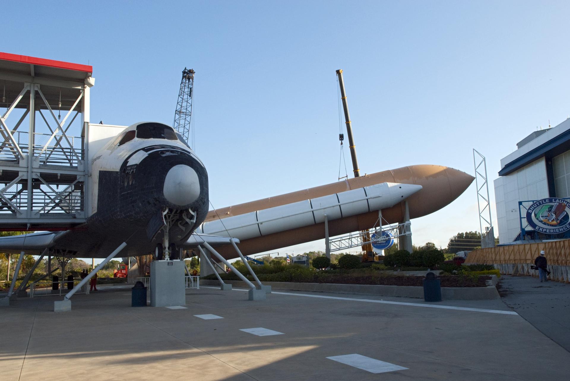 CAPE CANAVERAL, Fla. – Cranes remove a full-size, 149-foot-long, space shuttle solid rocket booster, or SRB, replica from the Kennedy Space Center Visitor Complex as the space-themed attraction makes way for a new exhibit featuring space shuttle Atlantis, which is currently undergoing preparations to go on public display. The SRB is being placed into temporary storage at NASA's Kennedy Space Center. The SRB was part of a mockup of the external tank and two SRBs at the visitor complex that were used to show visitors the size of actual space shuttle components. A space shuttle rode piggyback on the tank and boosters at liftoff and during the ascent into space. The SRBs burned out after about two-and-a-half minutes of flight. After recovery from the ocean, the boosters could be used repeatedly. Photo credit: NASA/Jim Grossmann