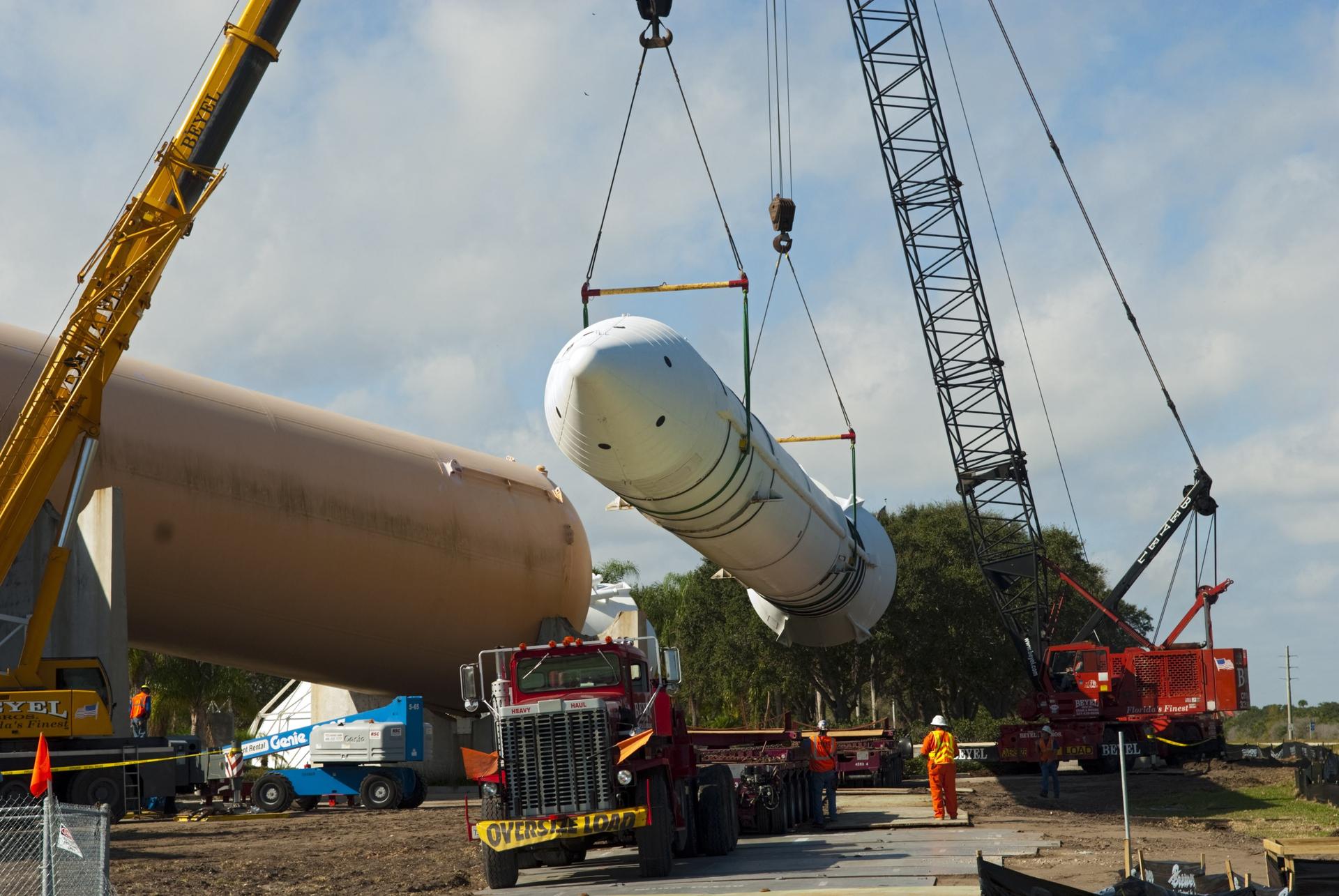CAPE CANAVERAL, Fla. – Cranes remove a full-size, 149-foot-long, space shuttle solid rocket booster, or SRB, replica from the Kennedy Space Center Visitor Complex as the space-themed attraction makes way for a new exhibit featuring space shuttle Atlantis, which is currently undergoing preparations to go on public display. The SRB is being placed into temporary storage at NASA's Kennedy Space Center. The SRB was part of a mockup of the external tank and two SRBs at the visitor complex that were used to show visitors the size of actual space shuttle components. A space shuttle rode piggyback on the tank and boosters at liftoff and during the ascent into space. The SRBs burned out after about two-and-a-half minutes of flight. After recovery from the ocean, the boosters could be used repeatedly. Photo credit: NASA/Jim Grossmann
