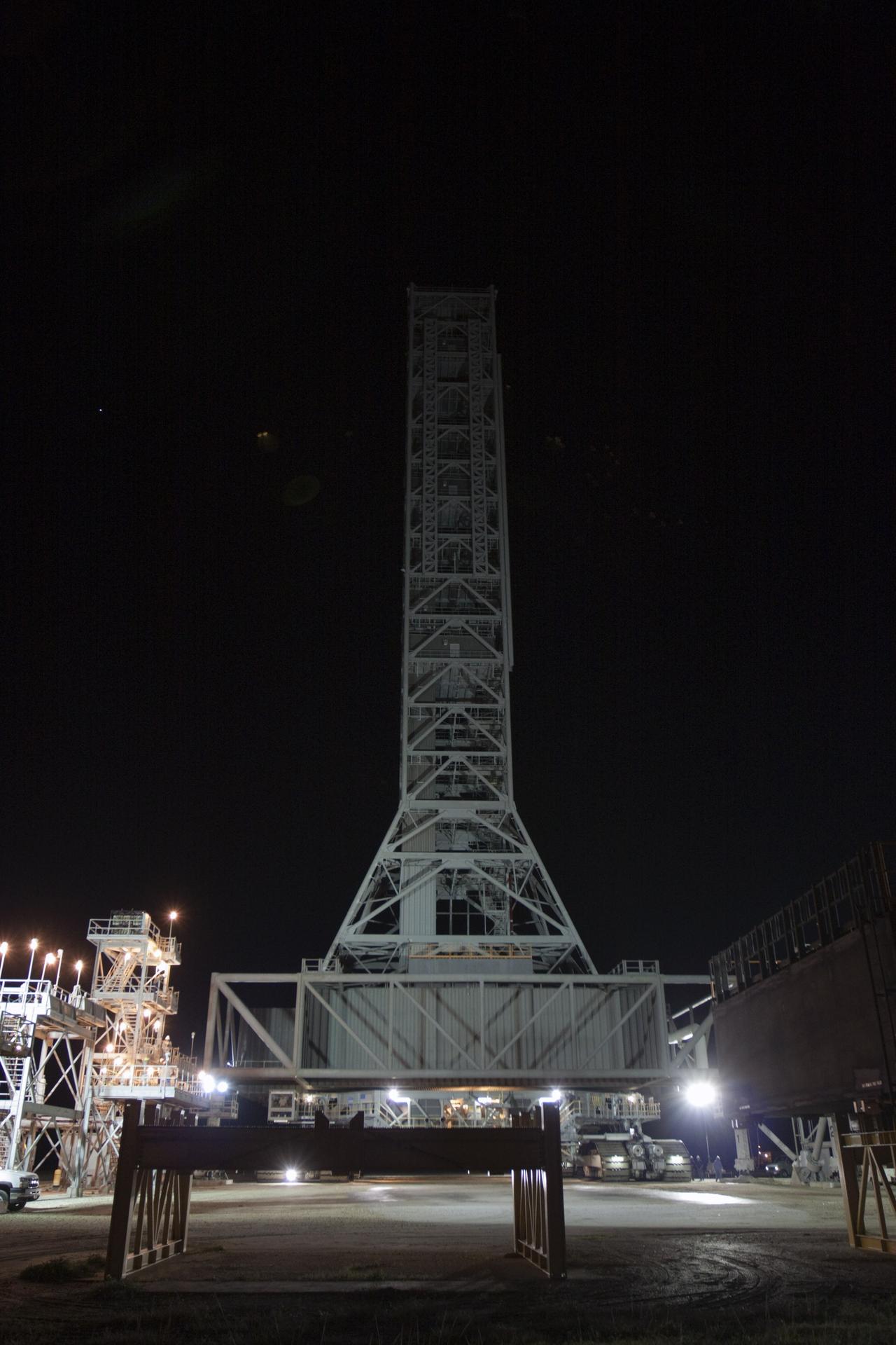 CAPE CANAVERAL, Fla. – The mobile launcher, or ML, arrives at the park site outside the Vehicle Assembly Building at NASA's Kennedy Space Center in Florida. The ML completed its 4.2-mile, day-long trek from Launch Pad 39B in darkness. Data on the ML collected from structural and functional engineering tests during its two-week stay on the pad will be used in the next phases of construction. The 355-foot-tall ML structure, which took about two years to construct, will be modified by NASA’s 21st Century Ground Systems Program to support NASA’s Space Launch System, the heavy-lift rocket that will launch astronauts into deep space on future exploration missions. For more information, visit http://www.nasa.gov/exploration/systems/sls. Photo credit: NASA/Kim Shiflett