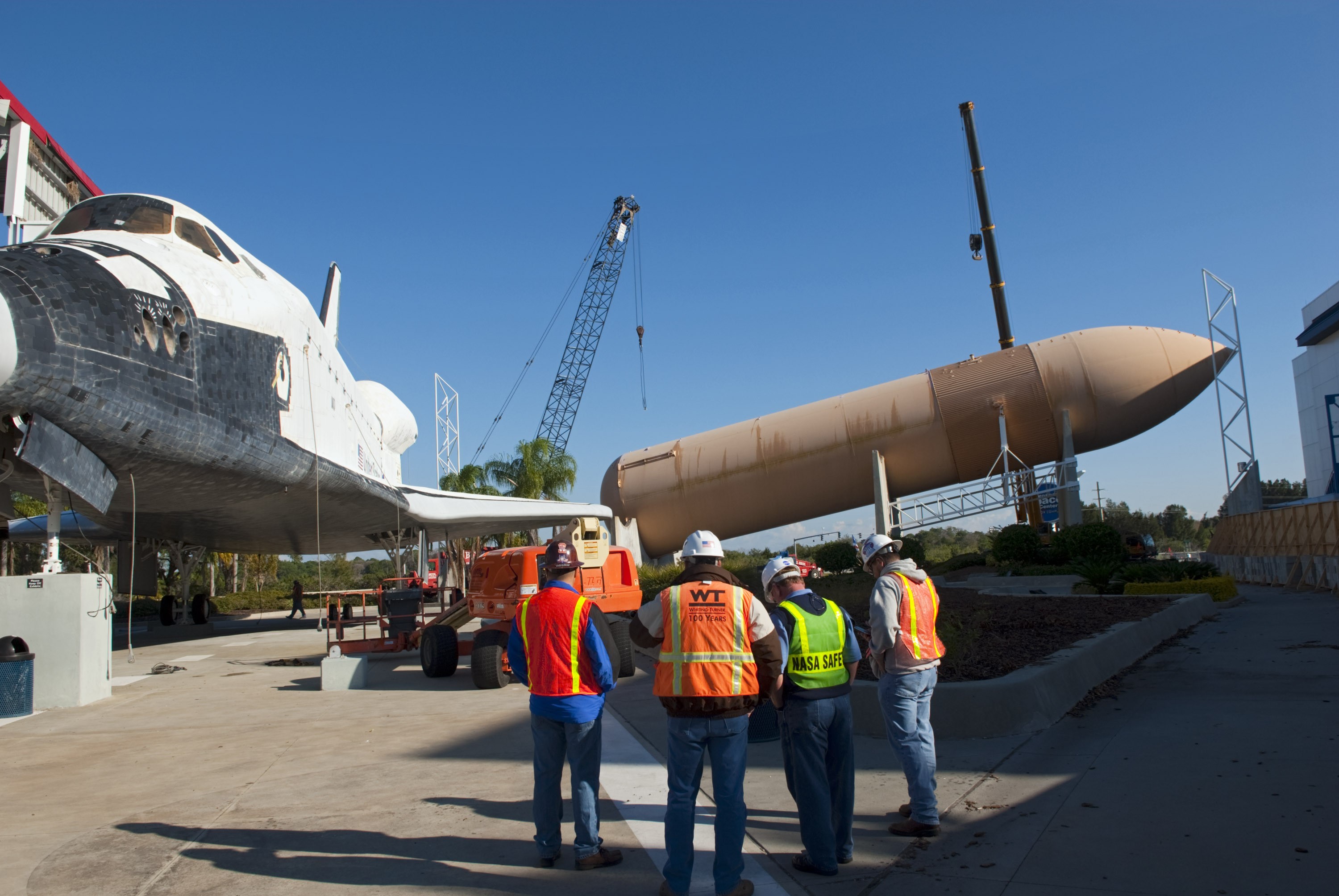 CAPE CANAVERAL, Fla. – Cranes remove a full-size replica of a space shuttle external fuel tank from the Kennedy Space Center Visitor Complex as the space-themed attraction makes way for a new exhibit featuring space shuttle Atlantis, which is currently undergoing preparations to go on public display. The tank is being placed into temporary storage at NASA's Kennedy Space Center. The tank was part of a mockup of the external tank and two solid rocket boosters at the visitor complex that were used to show visitors the size of actual space shuttle components. A space shuttle rode piggyback on the tank and boosters at liftoff and during the ascent into space. The tank, which held propellants for the shuttle's three main engines, was not reused, but burned up in the atmosphere and fell into the ocean. Photo credit: NASA/Jim Grossman