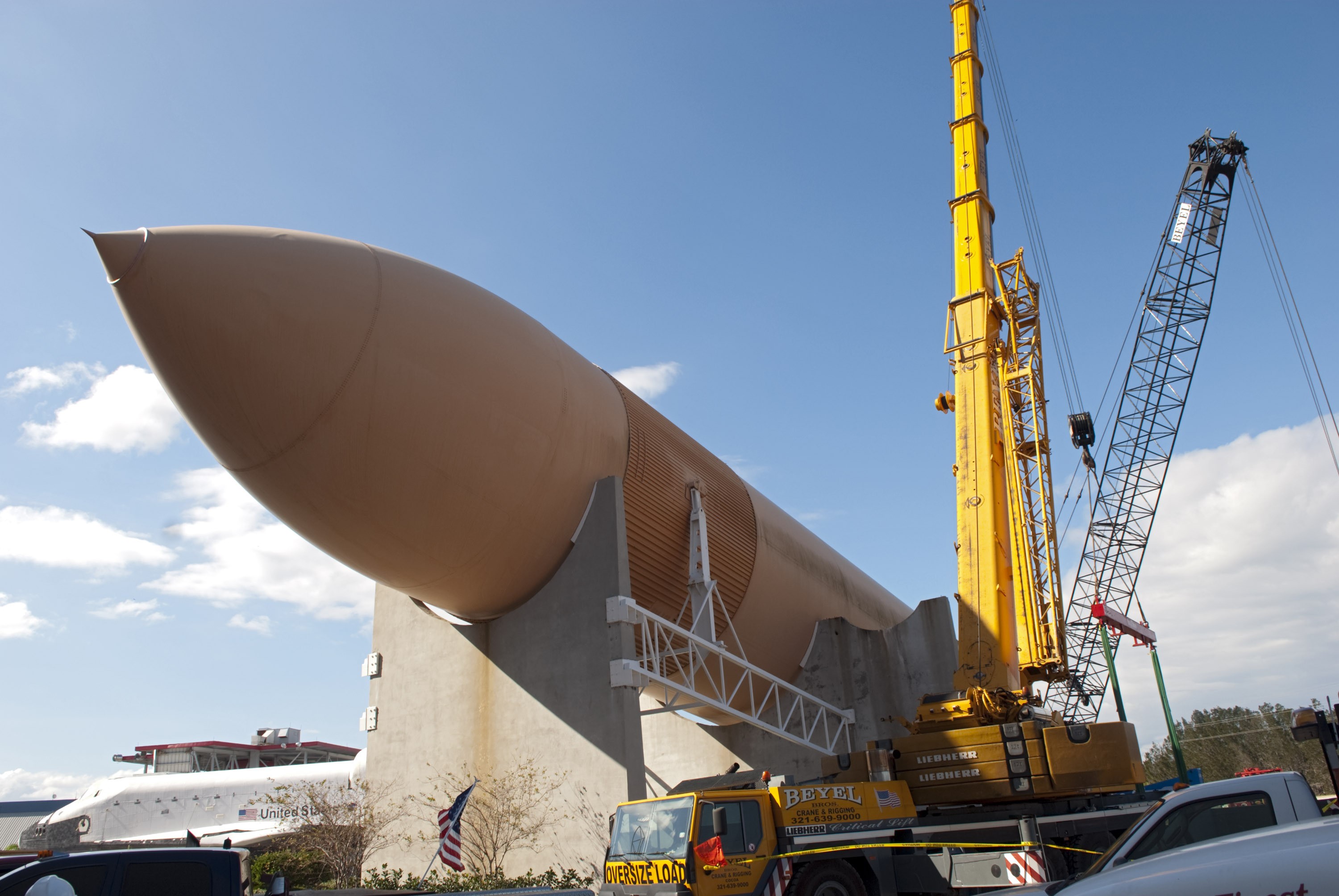 CAPE CANAVERAL, Fla. – Cranes remove a full-size replica of a space shuttle external fuel tank from the Kennedy Space Center Visitor Complex as the space-themed attraction makes way for a new exhibit featuring space shuttle Atlantis, which is currently undergoing preparations to go on public display. The tank is being placed into temporary storage at NASA's Kennedy Space Center. The tank was part of a mockup of the external tank and two solid rocket boosters at the visitor complex that were used to show visitors the size of actual space shuttle components. A space shuttle rode piggyback on the tank and boosters at liftoff and during the ascent into space. The tank, which held propellants for the shuttle's three main engines, was not reused, but burned up in the atmosphere and fell into the ocean. Photo credit: NASA/Jim Grossman