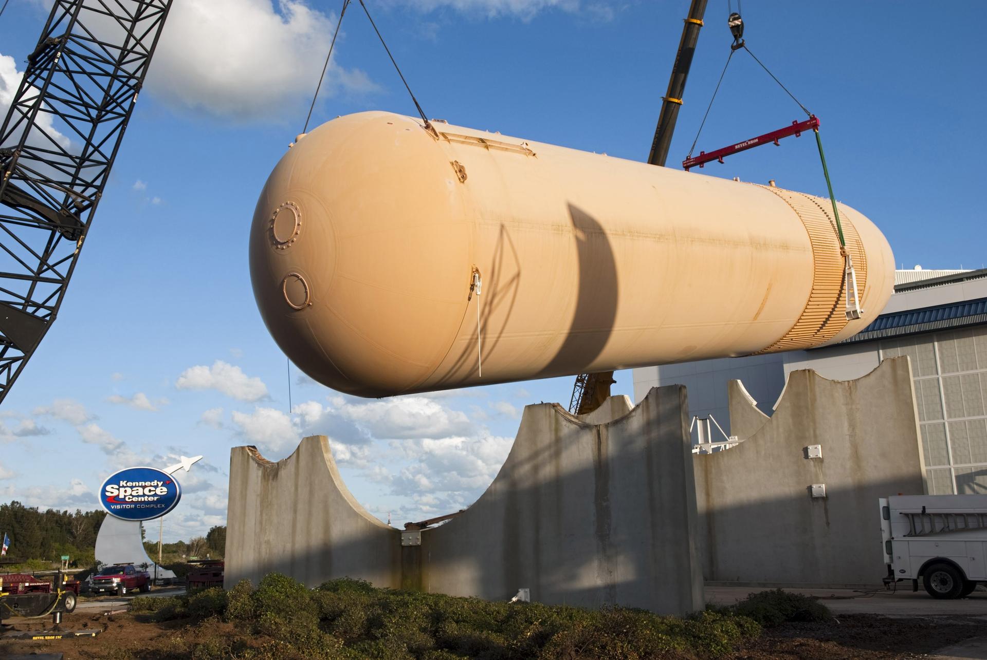 CAPE CANAVERAL, Fla. – Cranes remove a full-size replica of a space shuttle external fuel tank from the Kennedy Space Center Visitor Complex as the space-themed attraction makes way for a new exhibit featuring space shuttle Atlantis, which is currently undergoing preparations to go on public display. The tank is being placed into temporary storage at NASA's Kennedy Space Center. The tank was part of a mockup of the external tank and two solid rocket boosters at the visitor complex that were used to show visitors the size of actual space shuttle components. A space shuttle rode piggyback on the tank and boosters at liftoff and during the ascent into space. The tank, which held propellants for the shuttle's three main engines, was not reused, but burned up in the atmosphere and fell into the ocean. Photo credit: NASA/Jim Grossman
