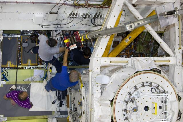 CAPE CANAVERAL, Fla. – Inside Orbiter Processing Facility-1 at NASA’s Kennedy Space Center in Florida, technicians re-install the three fuel cells in space shuttle Discovery’s mid-body. The fuel cells were removed and drained of all fluids. The hydrogen and oxygen dewars which feed reactants to the fuel cells remain in Discovery’s mid-body and have been purged with inert gases and vented down. The work is part of the Space Shuttle Program’s transition and retirement processing of shuttle Discovery. Discovery is being prepared for display at the Smithsonian’s National Air and Space Museum, Steven F. Udvar-Hazy Center in Chantilly, Va. For more information, visit http://www.nasa.gov/shuttle. Photo credit: NASA/Dimitri Gerondidakis