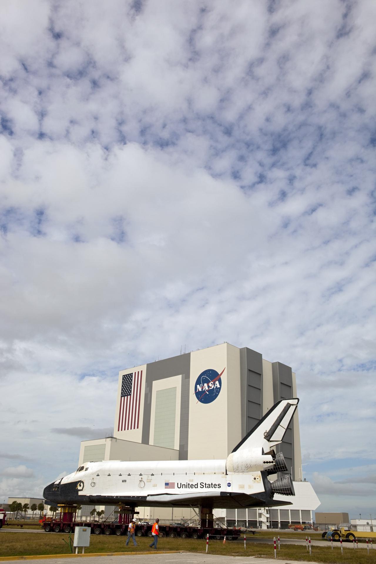 CAPE CANAVERAL, Fla. – The high-fidelity space shuttle model which was on display at the NASA Kennedy Space Center Visitor Complex in Florida backs toward its destination, Kennedy's Launch Complex 39 turn basin. The Vehicle Assembly Building across the street towers 525 feet above it. The shuttle was part of a display at the visitor complex that also included an external tank and two solid rocket boosters that were used to show visitors the size of actual space shuttle components. The full-scale shuttle model is being transferred from Kennedy to Space Center Houston, NASA Johnson Space Center's visitor center. The model will stay at the turn basin for a few months until it is ready to be transported to Texas via barge. The move also helps clear the way for the Kennedy Space Center Visitor Complex to begin construction of a new facility next year to display space shuttle Atlantis in 2013. For more information about Space Center Houston, visit http://www.spacecenter.org. Photo credit: NASA/Dimitri Gerondidakis