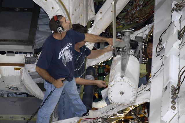 CAPE CANAVERAL, Fla. – Inside Orbiter Processing Facility-2 at NASA’s Kennedy Space Center in Florida, technicians assist as a special crane is used to lift one of the three fuel cells away from space shuttle Atlantis’ payload bay. The fuel cells will be drained of all fluids. The hydrogen and oxygen dewars which feed reactants to the fuel cells remain in Atlantis’ mid-body and will be purged with inert gases and vented down. The work is part of the Space Shuttle Program’s transition and retirement processing of shuttle Atlantis. The orbiter is being prepared for display at the Kennedy Space Center Visitor Complex. Photo credit: NASA/Kim Shiflett