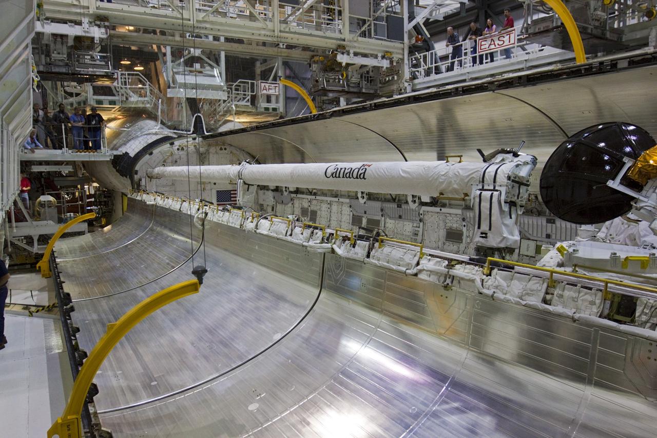 CAPE CANAVERAL, Fla. – In Orbiter Processing Facility-1 at NASA's Kennedy Space Center in Florida, one of space shuttle Discovery’s payload bay doors is lifted shut with the aid of yellow-painted strongbacks, hardware used to support and operate the doors when the shuttle is not in space. Discovery's payload bay doors are being closed for the final time during Space Shuttle Program transition and retirement activities. Following the door closure, the vehicle will be powered down for the last time. Discovery is being prepared for public display at the Smithsonian’s National Air and Space Museum Steven F. Udvar-Hazy Center in Chantilly, Va., in 2012. For more information, visit http://www.nasa.gov/shuttle. Photo credit: NASA/Kim Shiflett