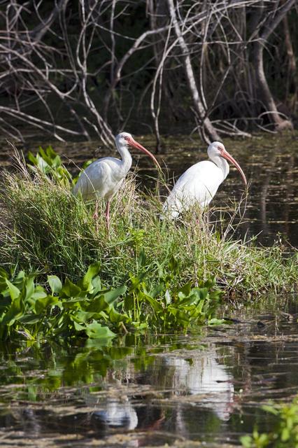 CAPE CANAVERAL, Fla. -- Two white ibises stand in parallel at the edge of a pond at NASA's Kennedy Space Center in Florida. The center shares a boundary with the Merritt Island National Wildlife Refuge, consisting of 140,000 acres. The refuge provides a wide variety of habitats -- coastal dunes, saltwater estuaries and marshes, freshwater impoundments, scrub, pine flatwoods, and hardwood hammocks -- that provide sanctuary for more than 1,500 species of plants and animals, including about 331 species of birds. Photo credit: NASA/Jim Grossmann