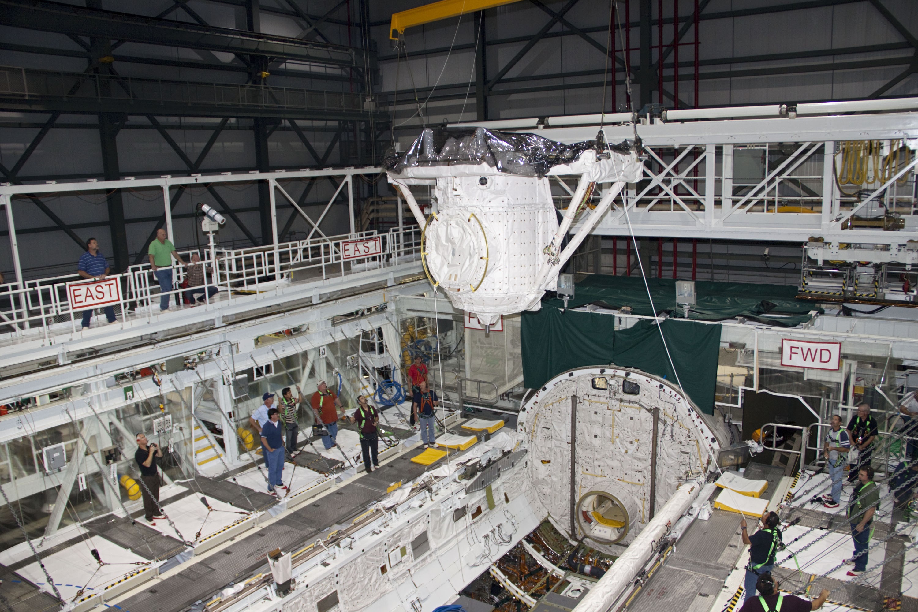 CAPE CANAVERAL, Fla. – A crane lifts the airlock from the cargo bay of space shuttle Atlantis in Orbiter Processing Facility-2 at NASA's Kennedy Space Center in Florida. The airlock was the connecting point between the shuttle and International Space Station. It was removed as part of the ongoing work to prepare the shuttles for public display. The shuttle is being prepared for display at the Kennedy Space Center Visitor Complex. Photo credit: NASA/Jim Grossmann