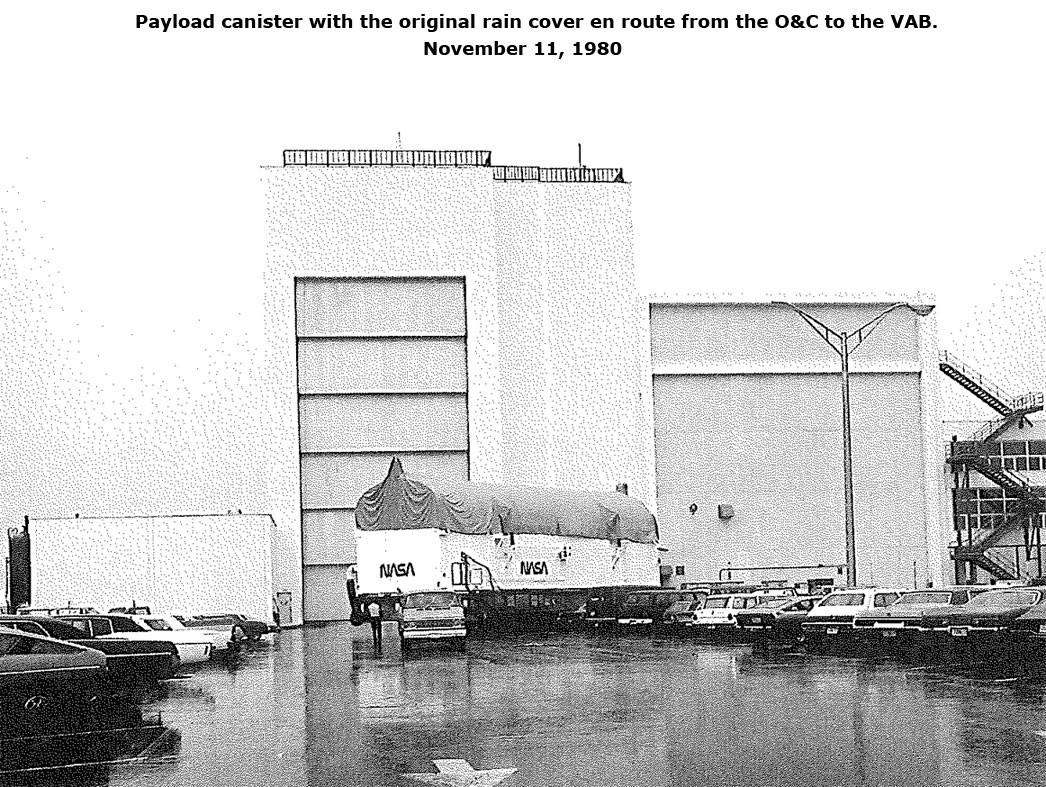 Payload canister with the original rain cover en route from the O&C to the VAB, November 11, 1980